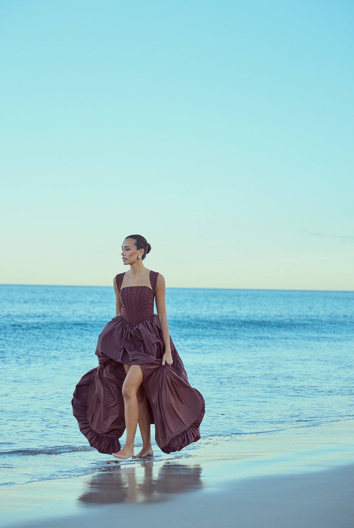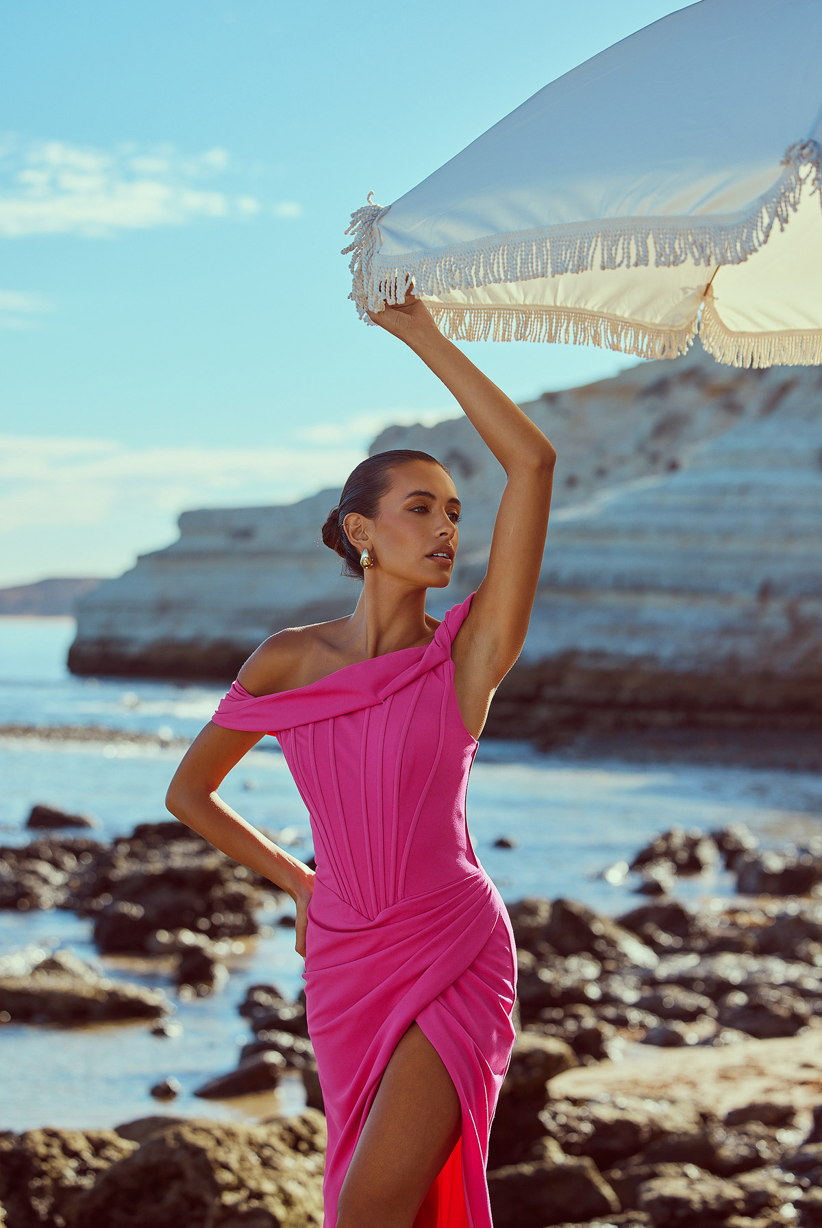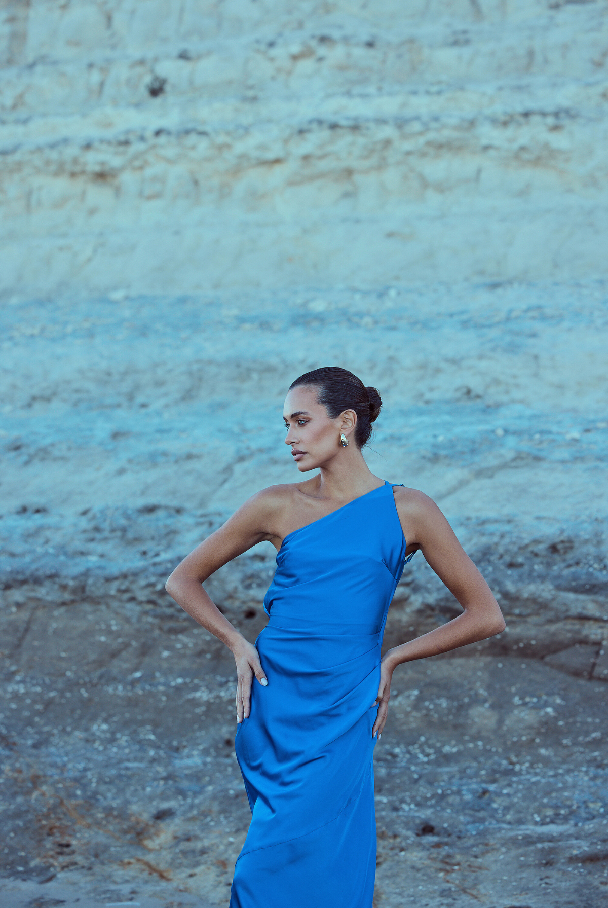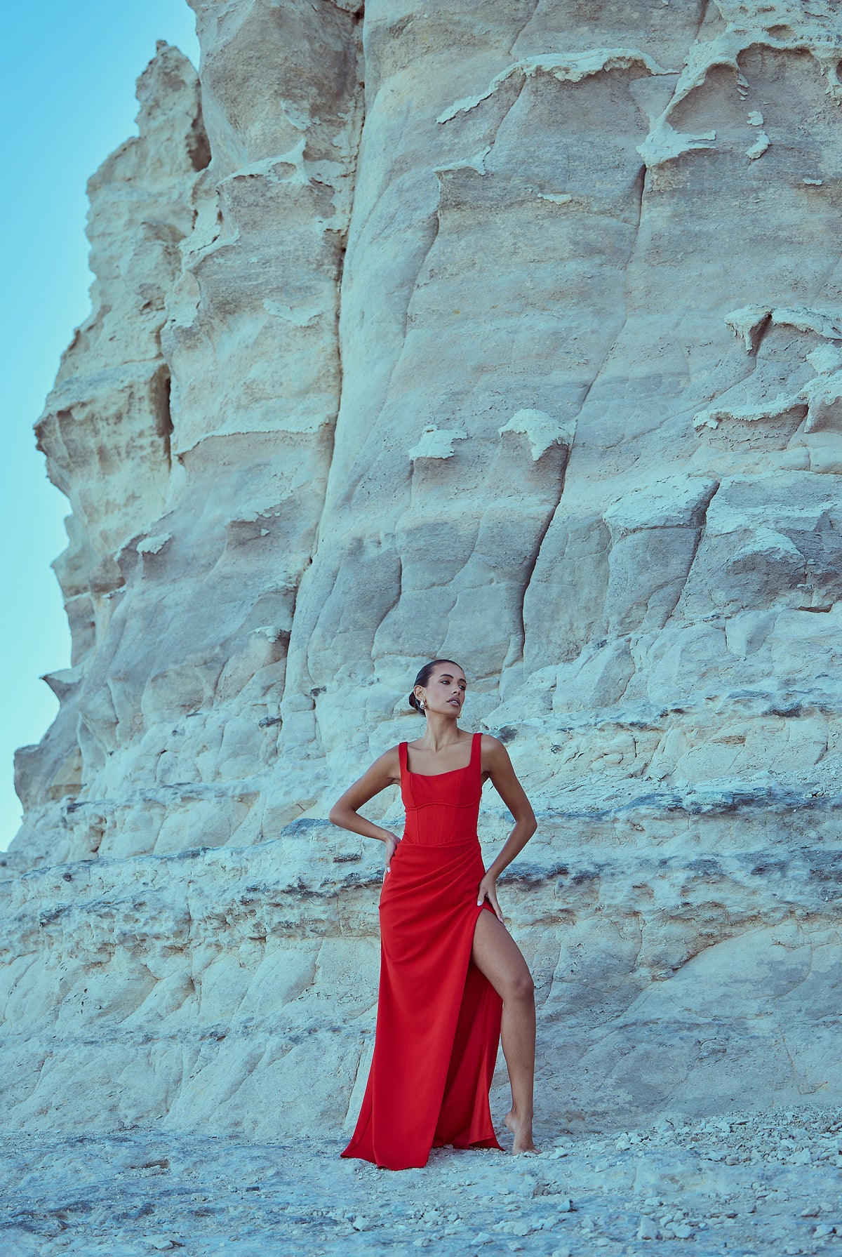 From silky satin dresses that move with the breeze, to sculptural crepe pieces that echo the shapes of sun-bleached stones and sea-carved cliffs - each outfit tells a story of freedom, individuality, and timeless elegance.