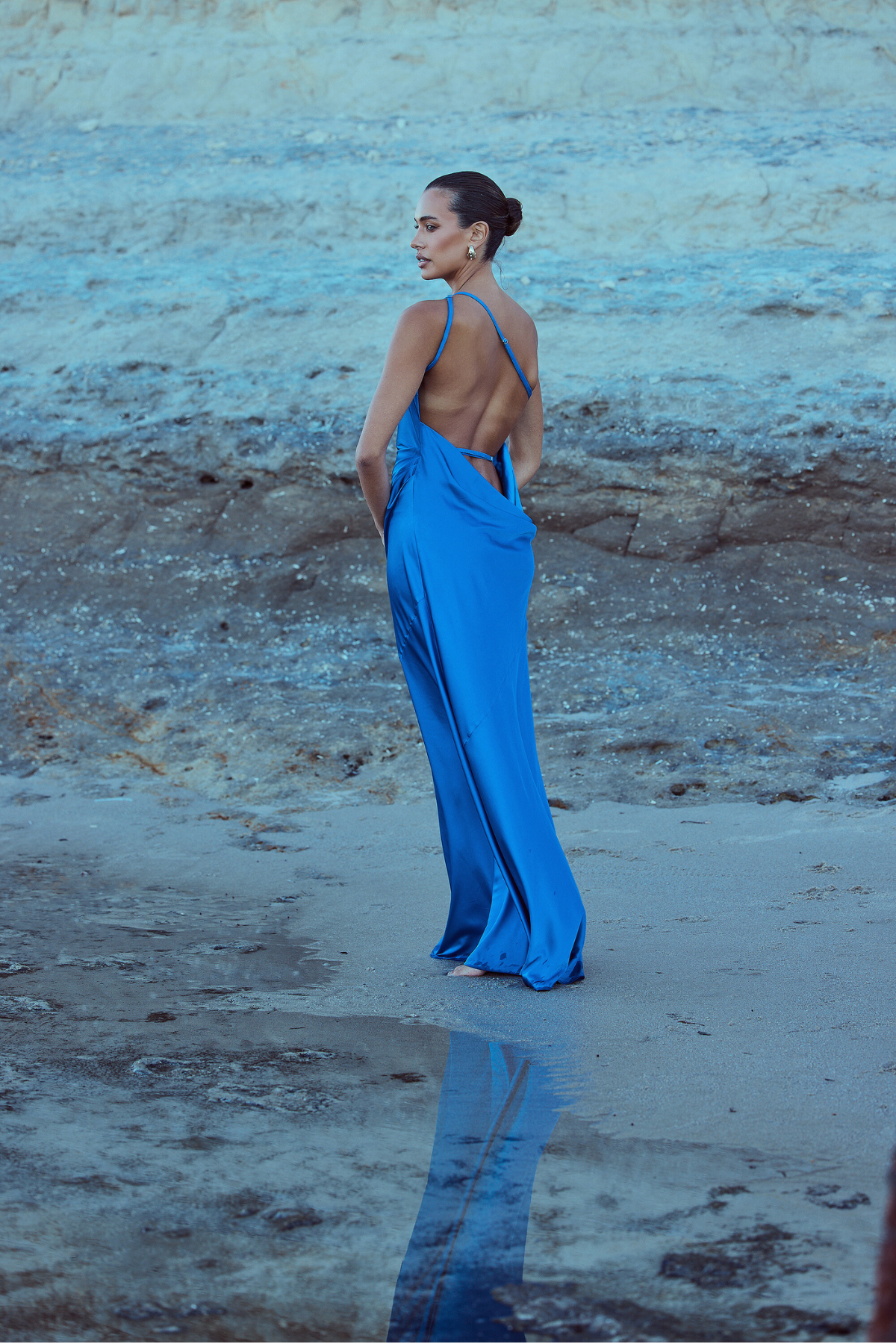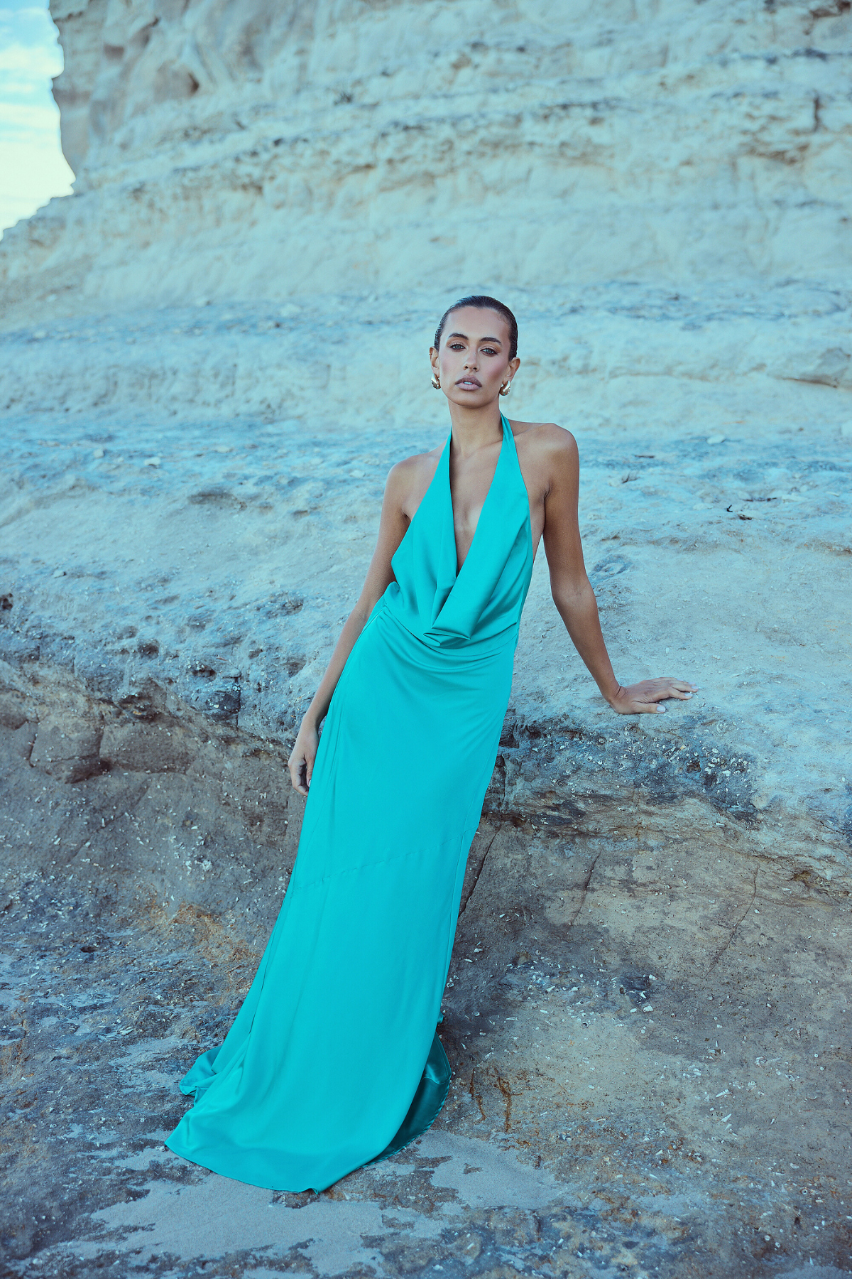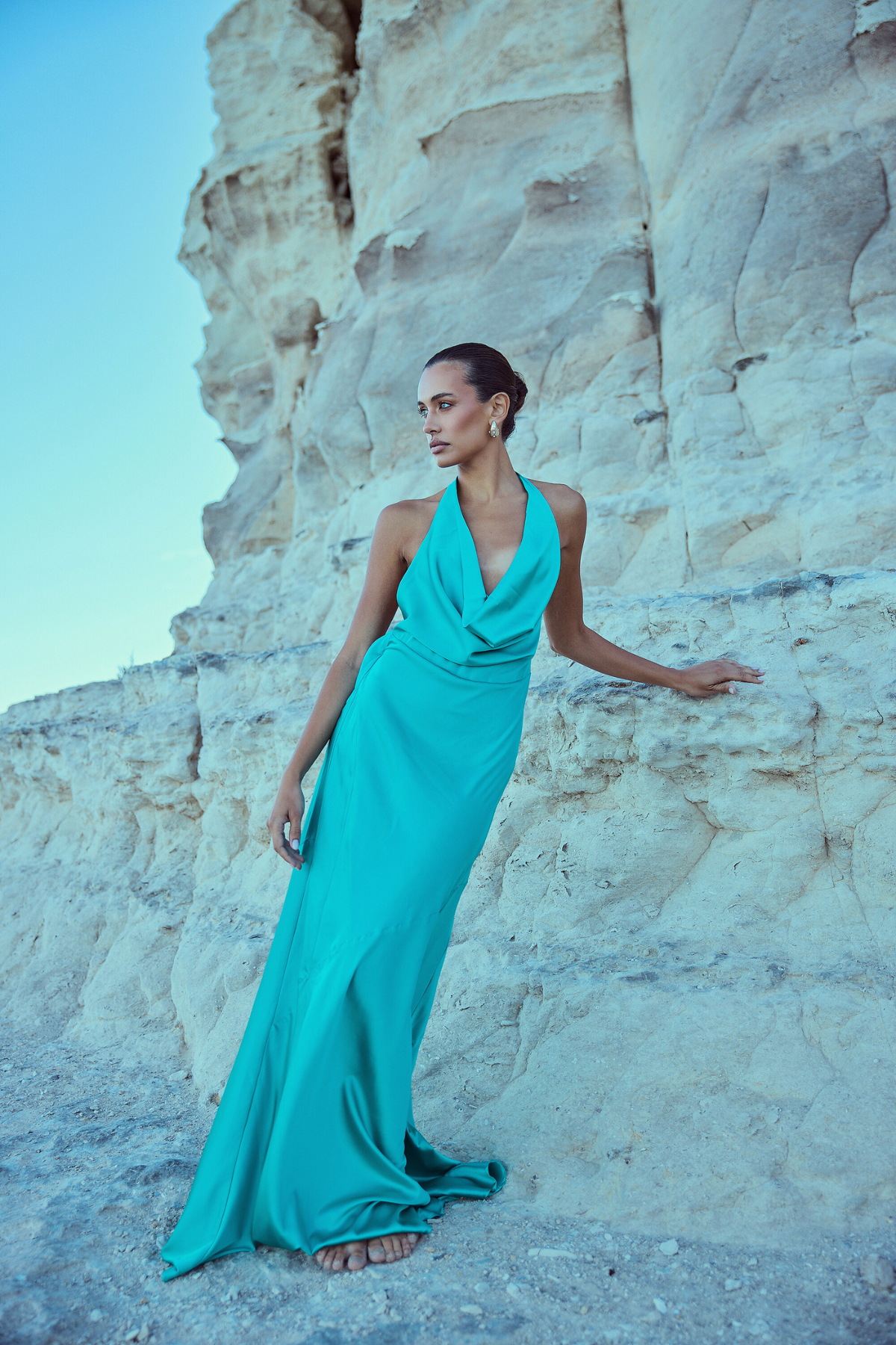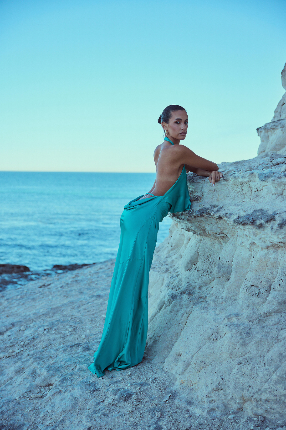 From silky satin dresses that move with the breeze, to sculptural crepe pieces that echo the shapes of sun-bleached stones and sea-carved cliffs - each outfit tells a story of freedom, individuality, and timeless elegance.
