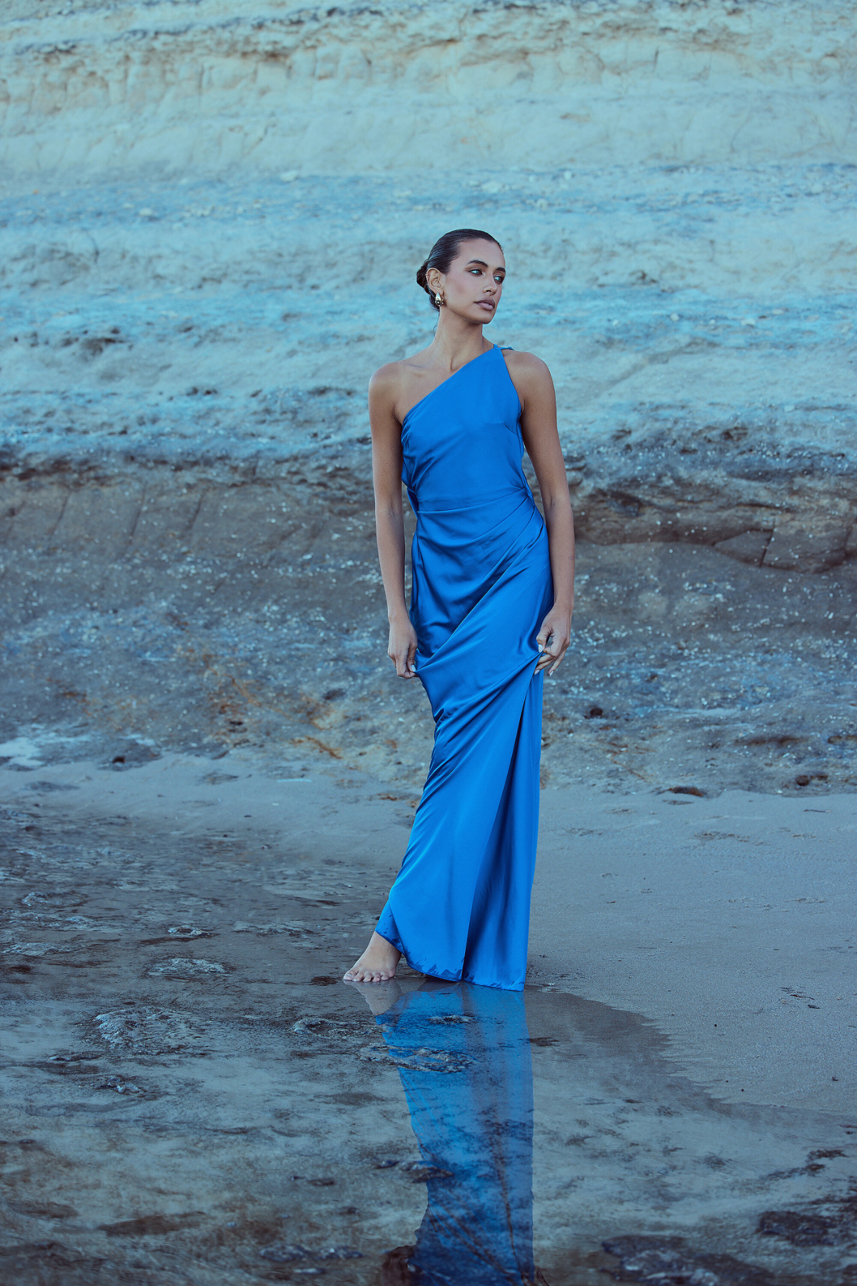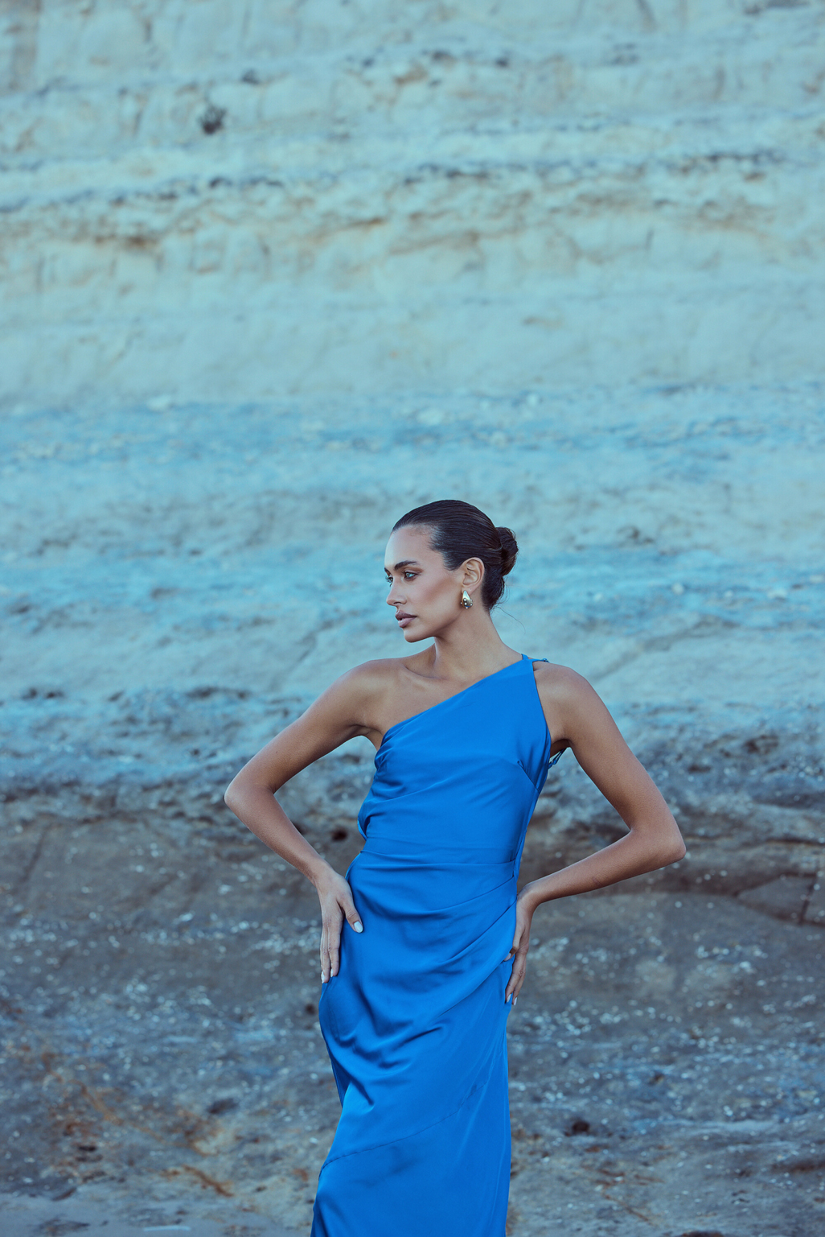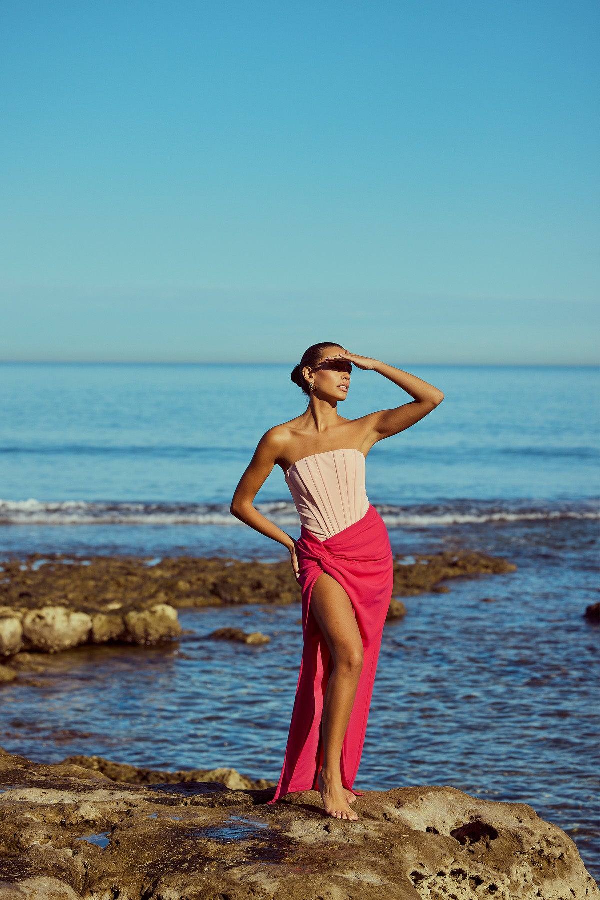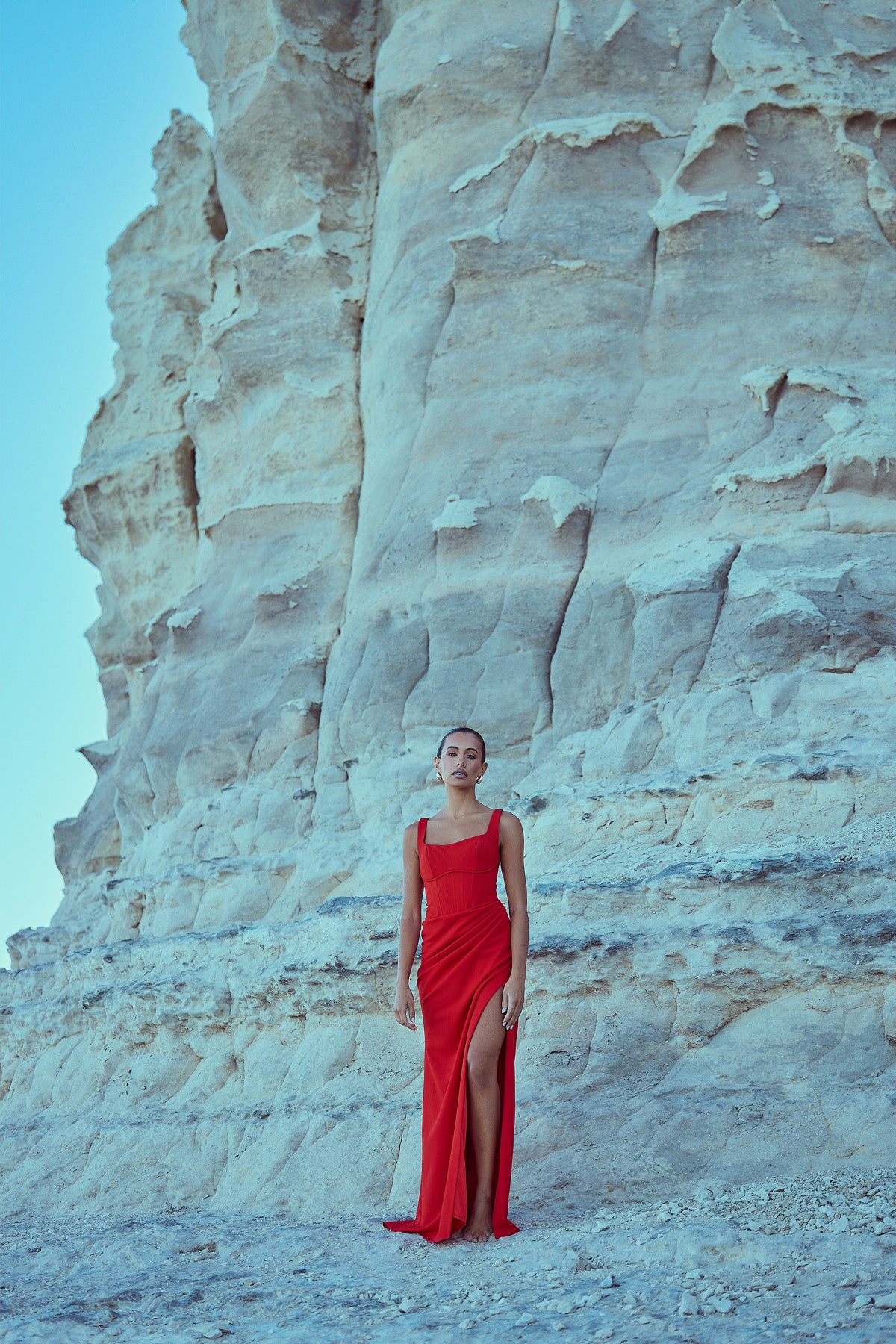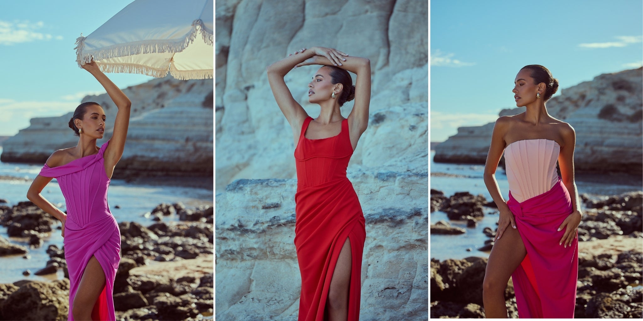 From silky satin dresses that move with the breeze, to sculptural crepe pieces that echo the shapes of sun-bleached stones and sea-carved cliffs - each outfit tells a story of freedom, individuality, and timeless elegance.