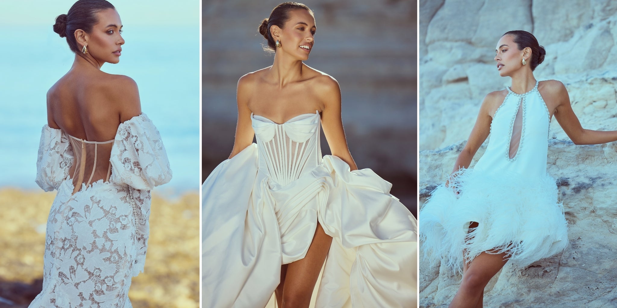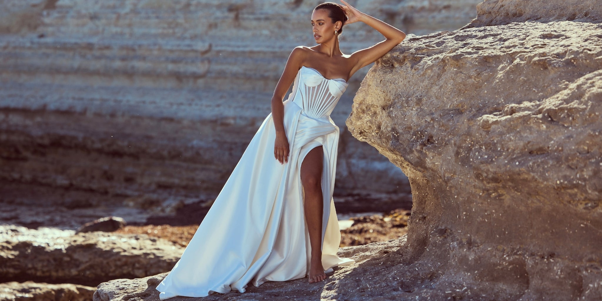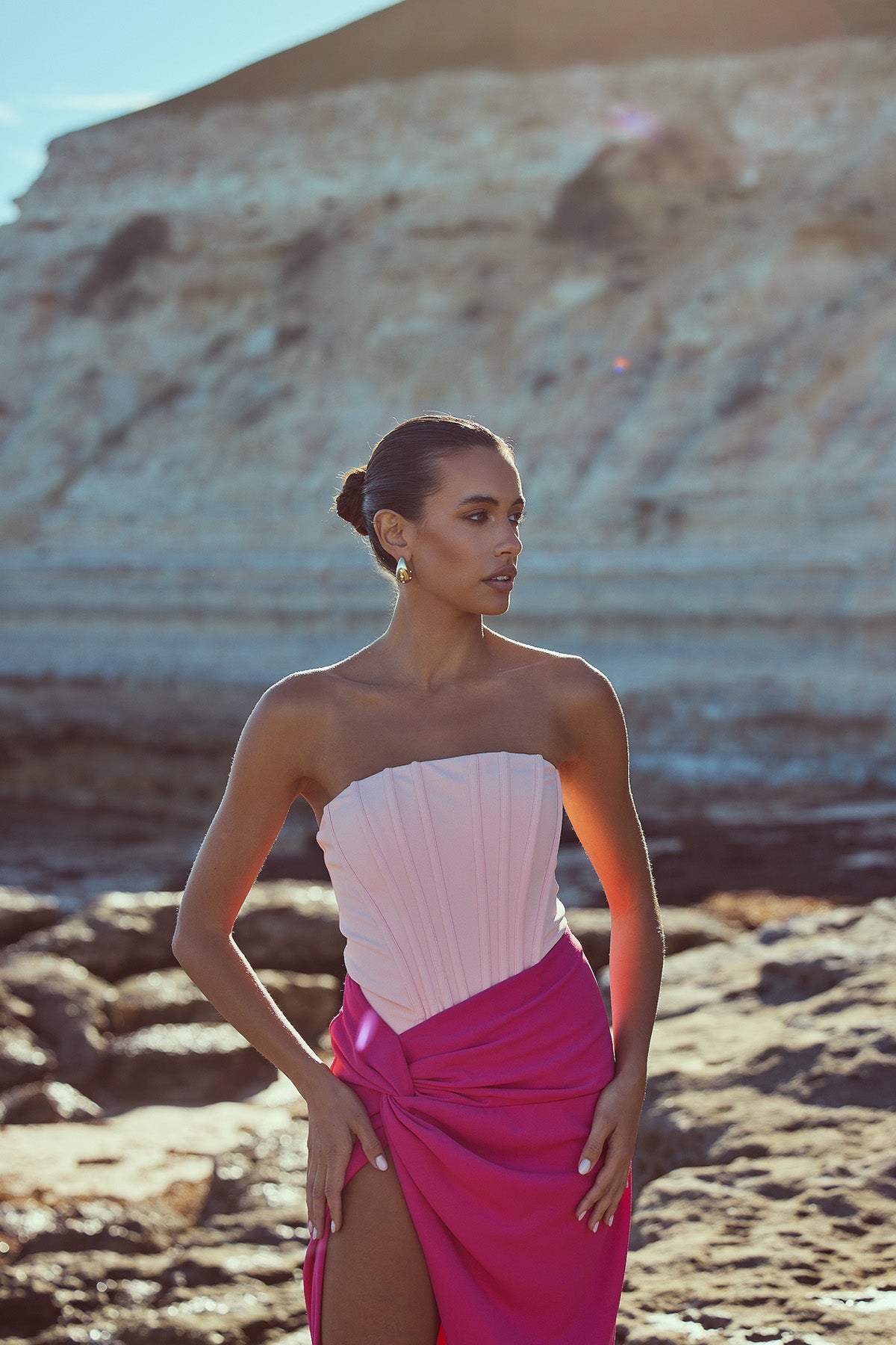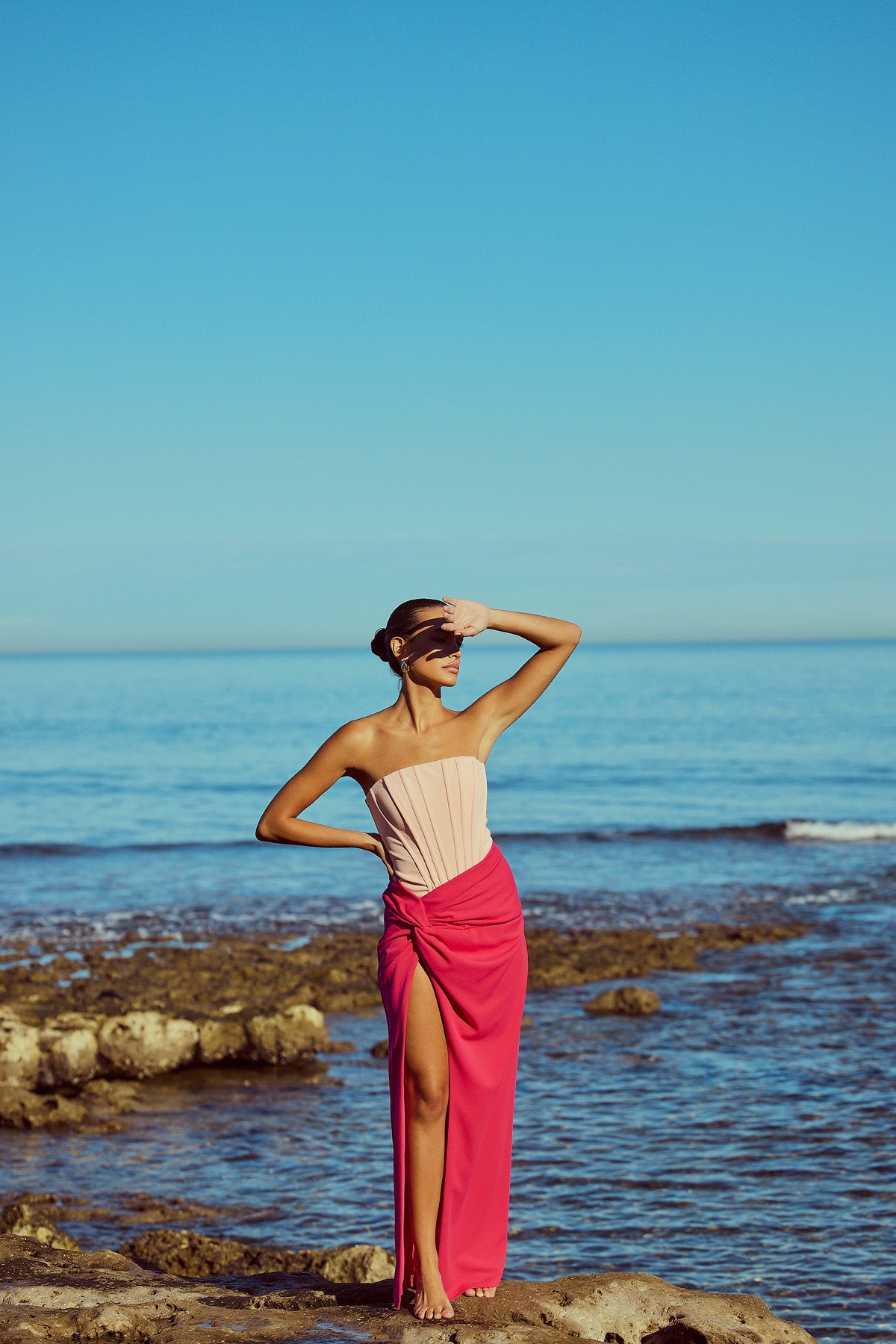 From silky satin dresses that move with the breeze, to sculptural crepe pieces that echo the shapes of sun-bleached stones and sea-carved cliffs - each outfit tells a story of freedom, individuality, and timeless elegance.