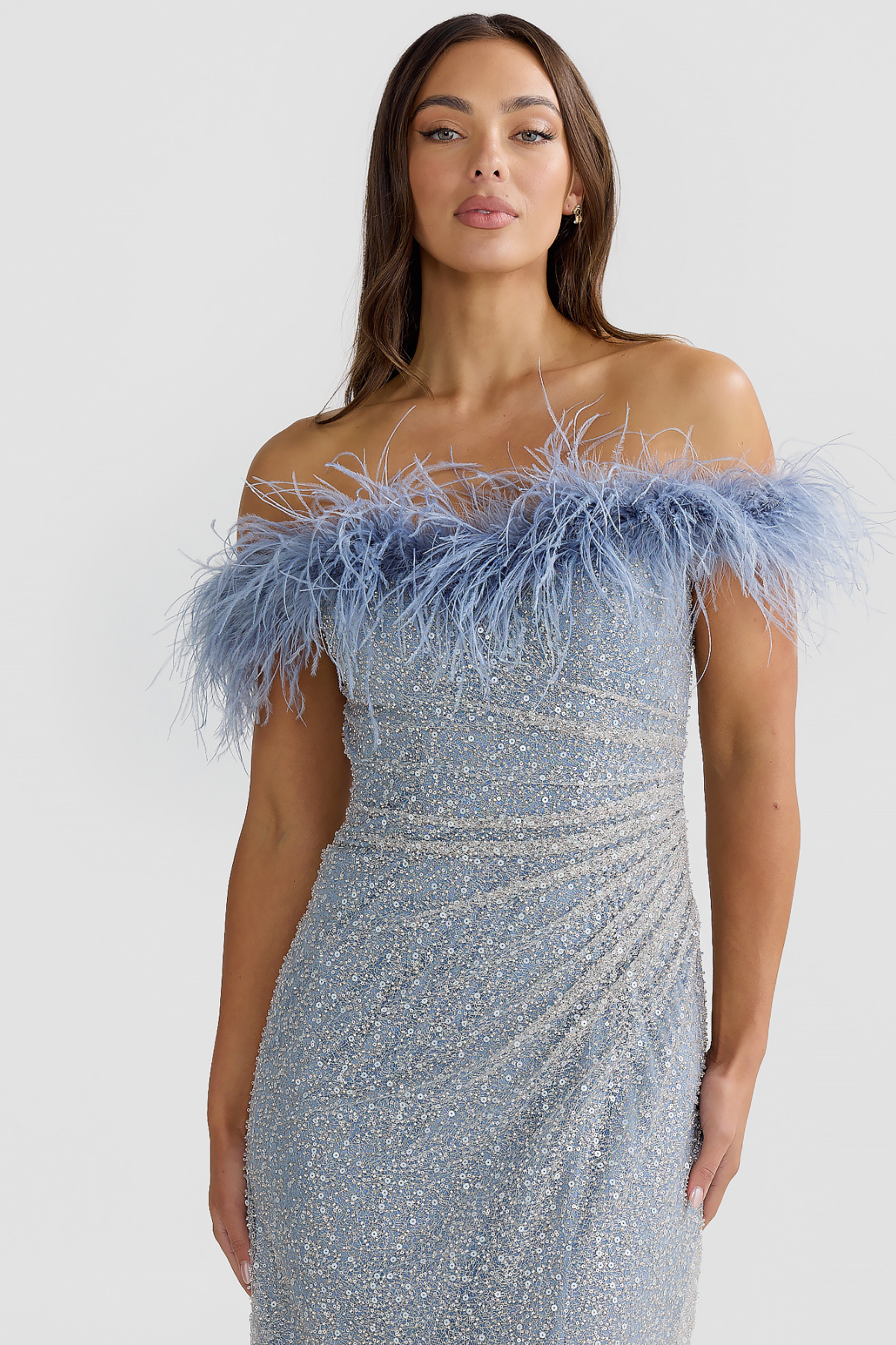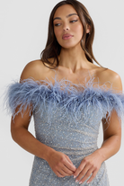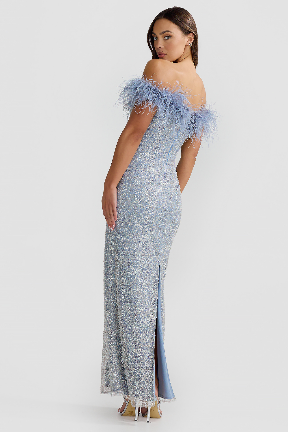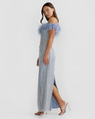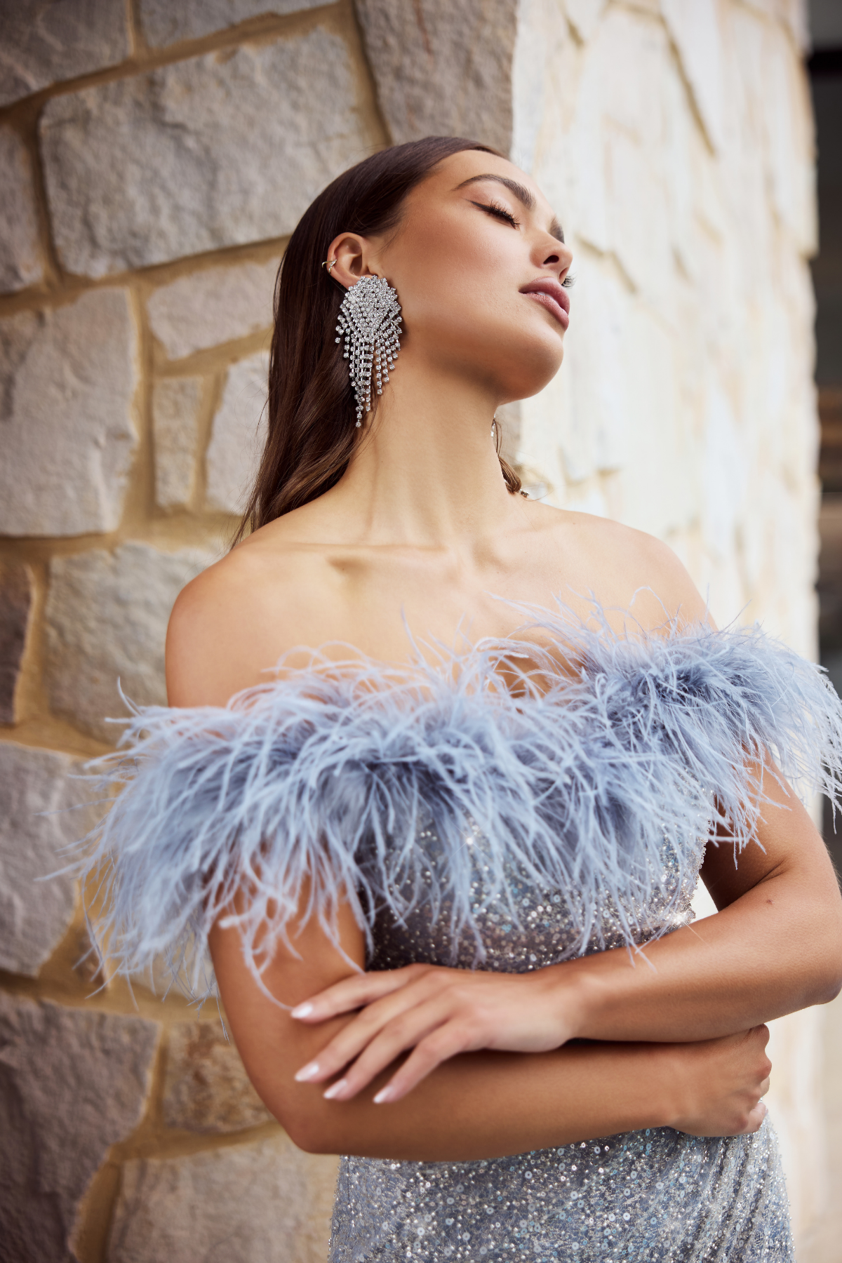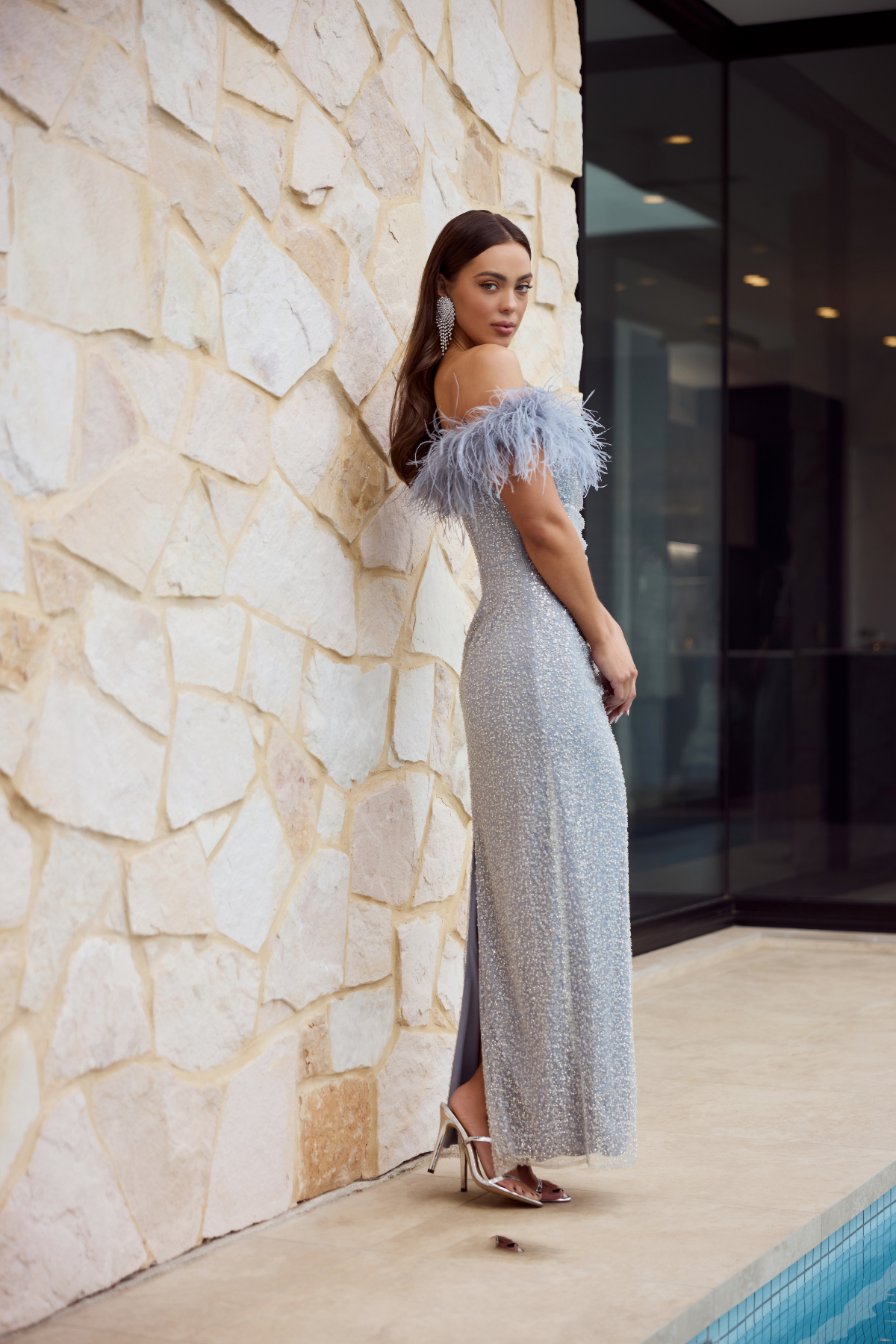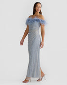 Step into a world of elegance with the Paloma Gown, a breathtaking piece designed for the woman who appreciates timeless beauty. This exquisite gown is crafted from luxurious, high-quality beaded fabric that features a hint of stretch, ensuring a comfortable fit that moves with you. Experience the softness and opulence of our off-shoulder design adorned with exquisite ostrich feathers. This gown is perfect for celebrating life’s special moments, bringing a touch of glamour to every occasion.