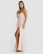 The Sierra Gown is a classic and modern evening silhouette. Featuring a sweetheart neckline that beautifully accentuates the décolletage, this gown is designed to fit and form the female shape. Tucks carefully placed by our artisans, creating a flattering silhouette for all shapes. The thigh slit adds a touch of allure, while the structured fabric ensures both comfort and style. Available in Powder Blue and Soft Pink.
