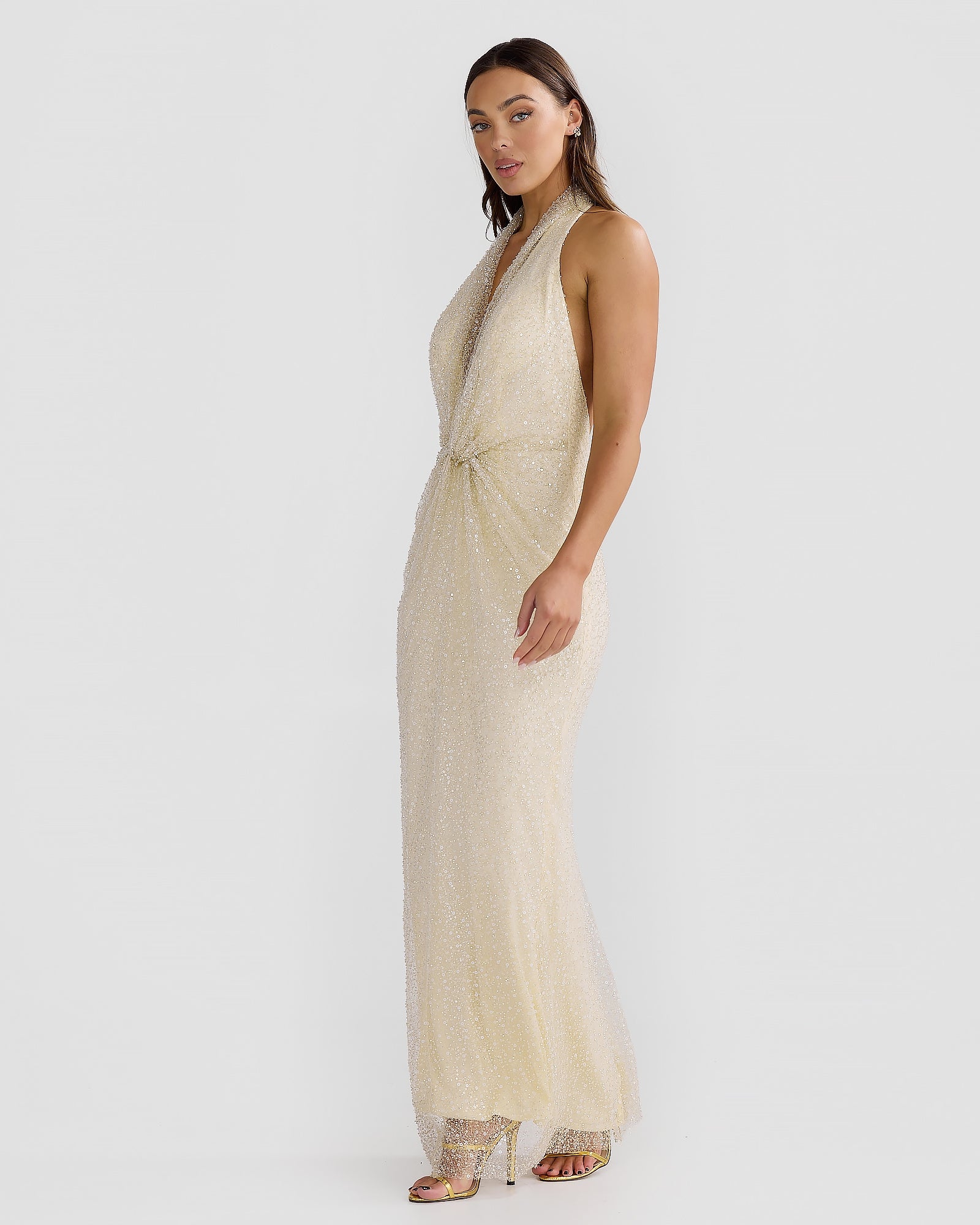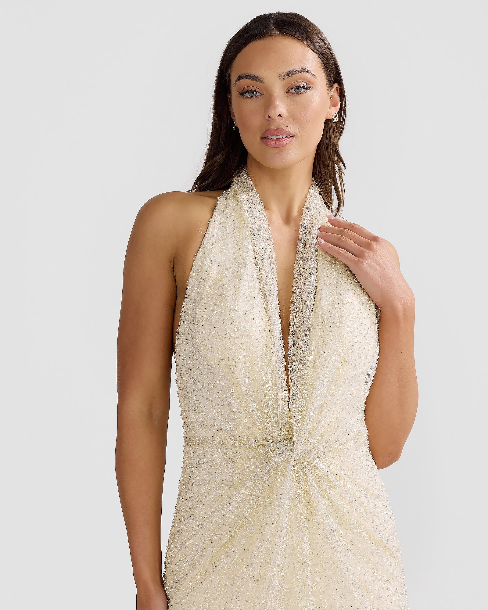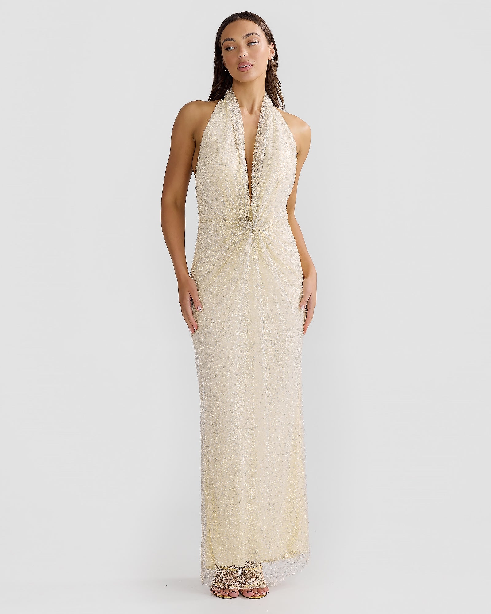 Introducing this seasons best selling Paola Gown in our new premium hand-beaded mesh. Featuring a timeless halter neckline with a twisted drape detail and scooped back. Designed to make you the centre of attention, this gown is perfect for celebrating life's special moments. Available in Beige and Powder Blue.
