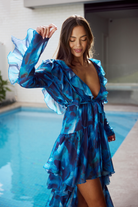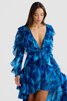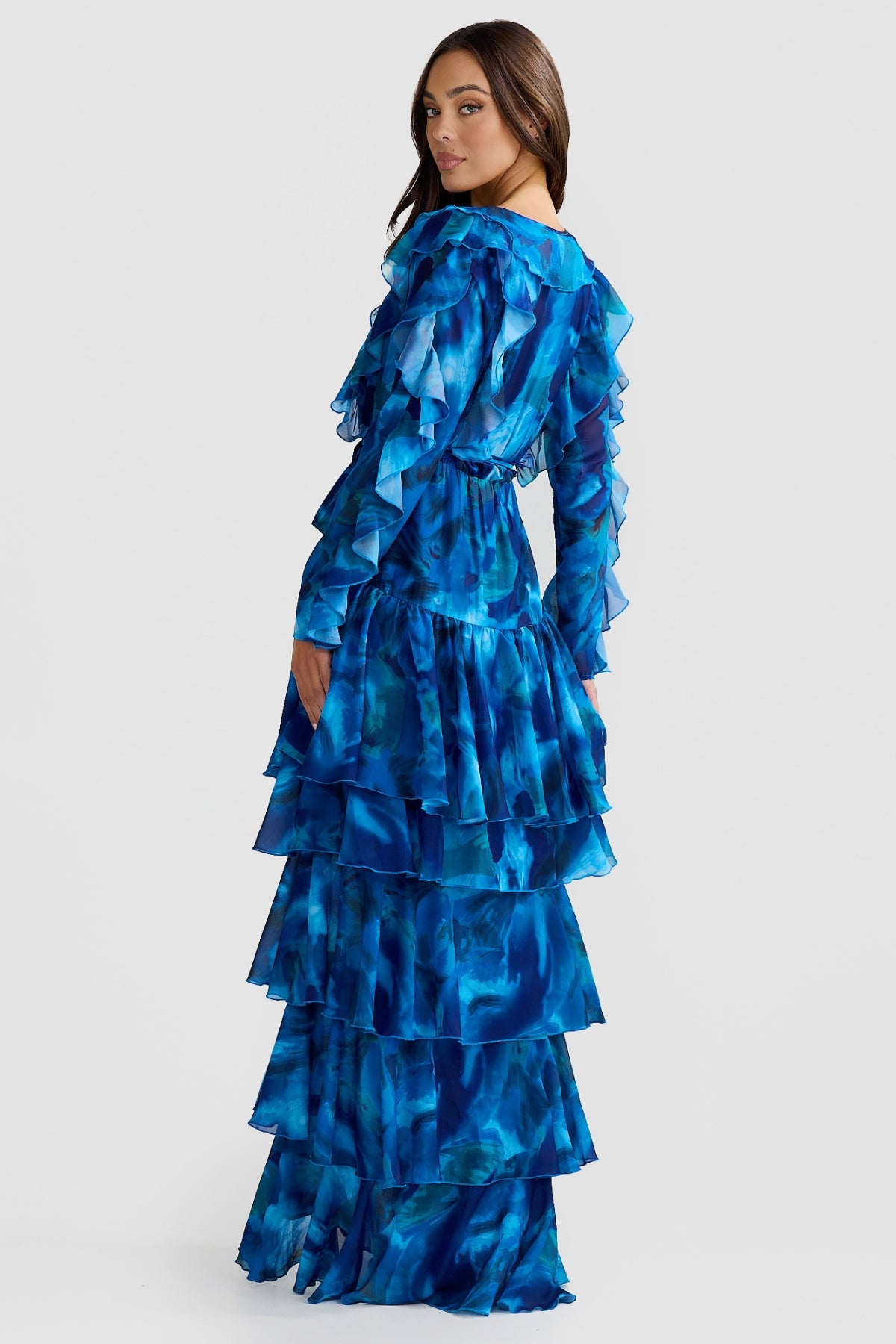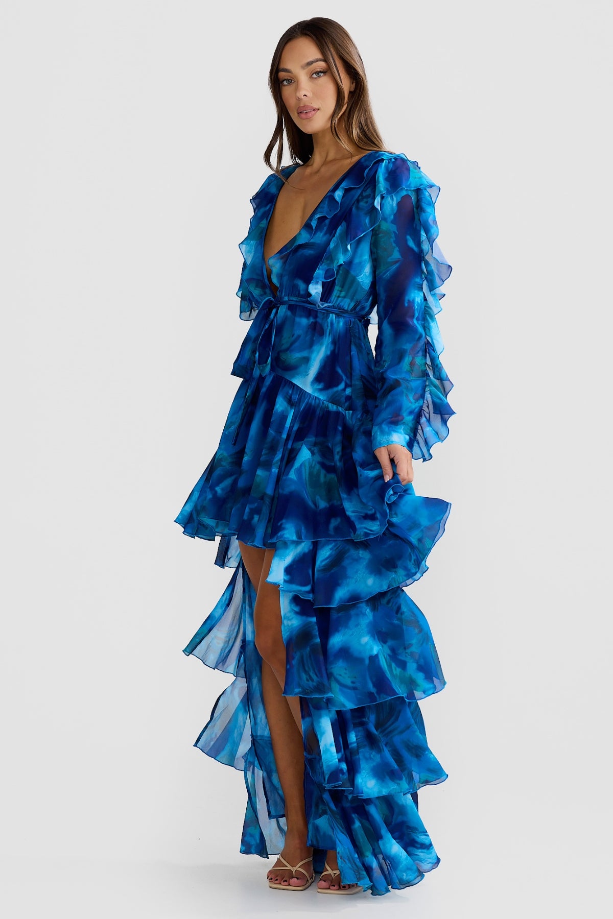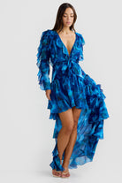 Embrace your free spirit with the Solana floaty chiffon Dress. Featuring this season's abstract blue floral print that dances with every movement. The layered ruffles with a high-low design bring edge to a bohemian flare. Ideal for warm-weather adventures or laid-back celebrations, this dress is a must-have for your wardrobe.