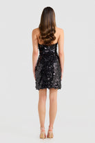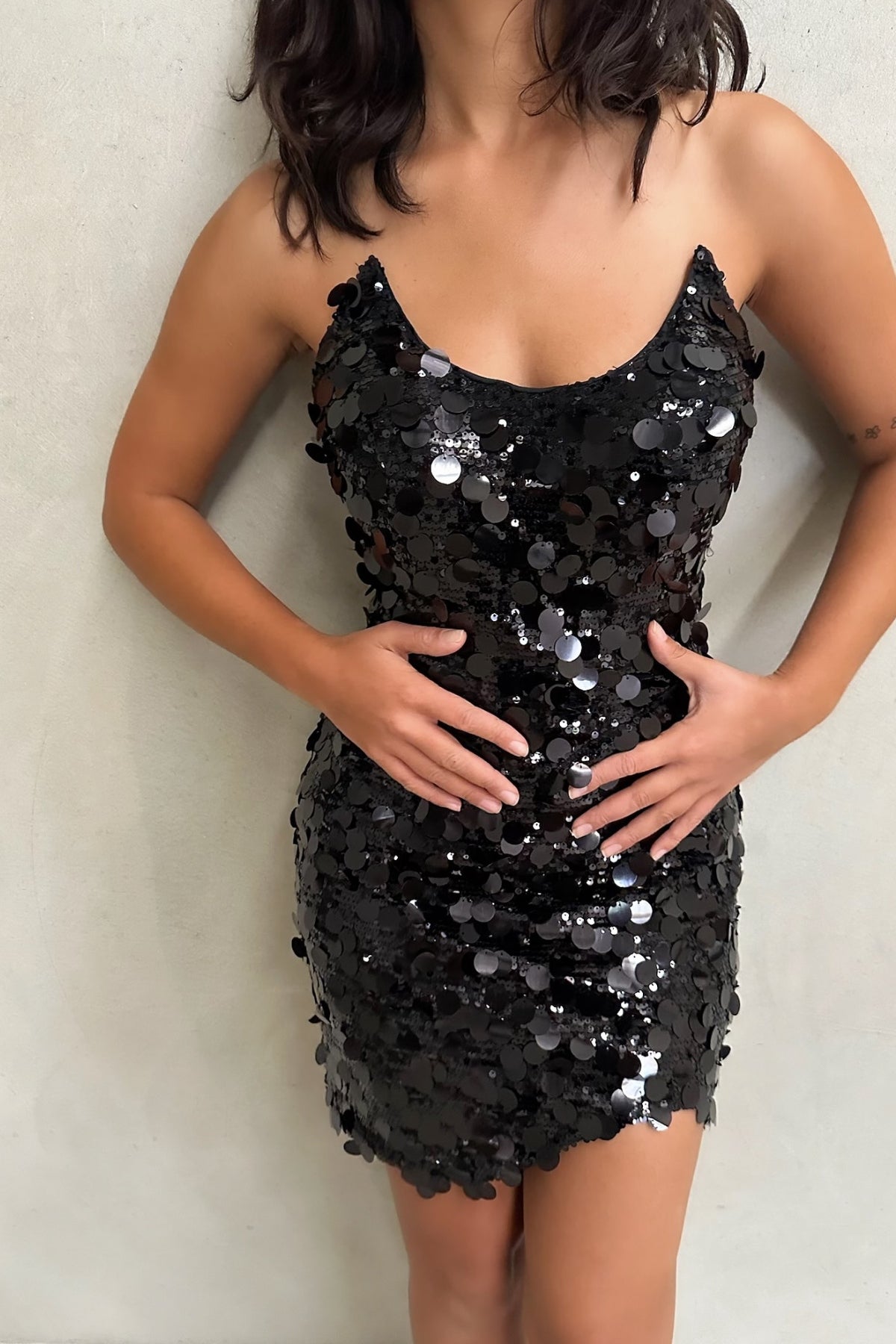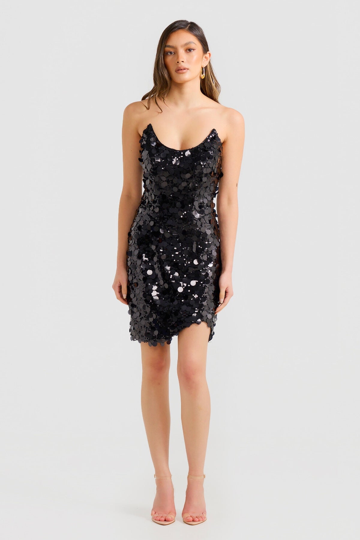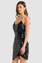 Dance the night away in our show stopping Galaxy Sequin Mini Dress. Constructed in a two dimensional sequin fabrication; this dress features a pointed neckline, boning and a asymmetrical hemline. Available in Silver and Black.
