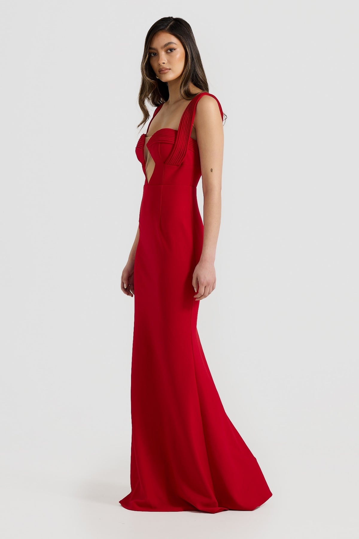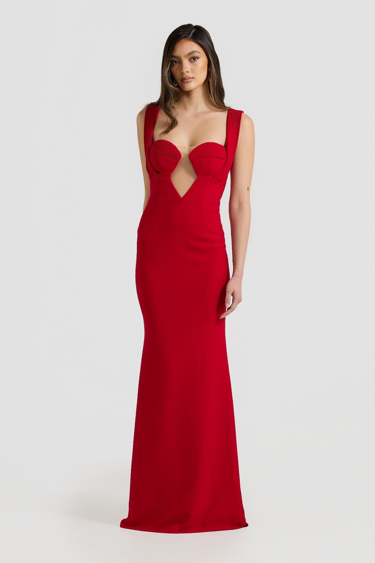 The Giselle gown is for those who desire a blend of classic elegance and contemporary style. The premium bonded stretch crepe fabric ensures a flawless fit. Featuring a centre-front mesh neckline and linear stitching details along the wide sat straps and bra cups. This gown is a perfect choice for any formal occasion. Available black and red.