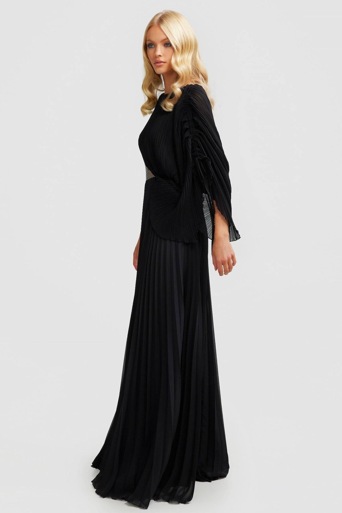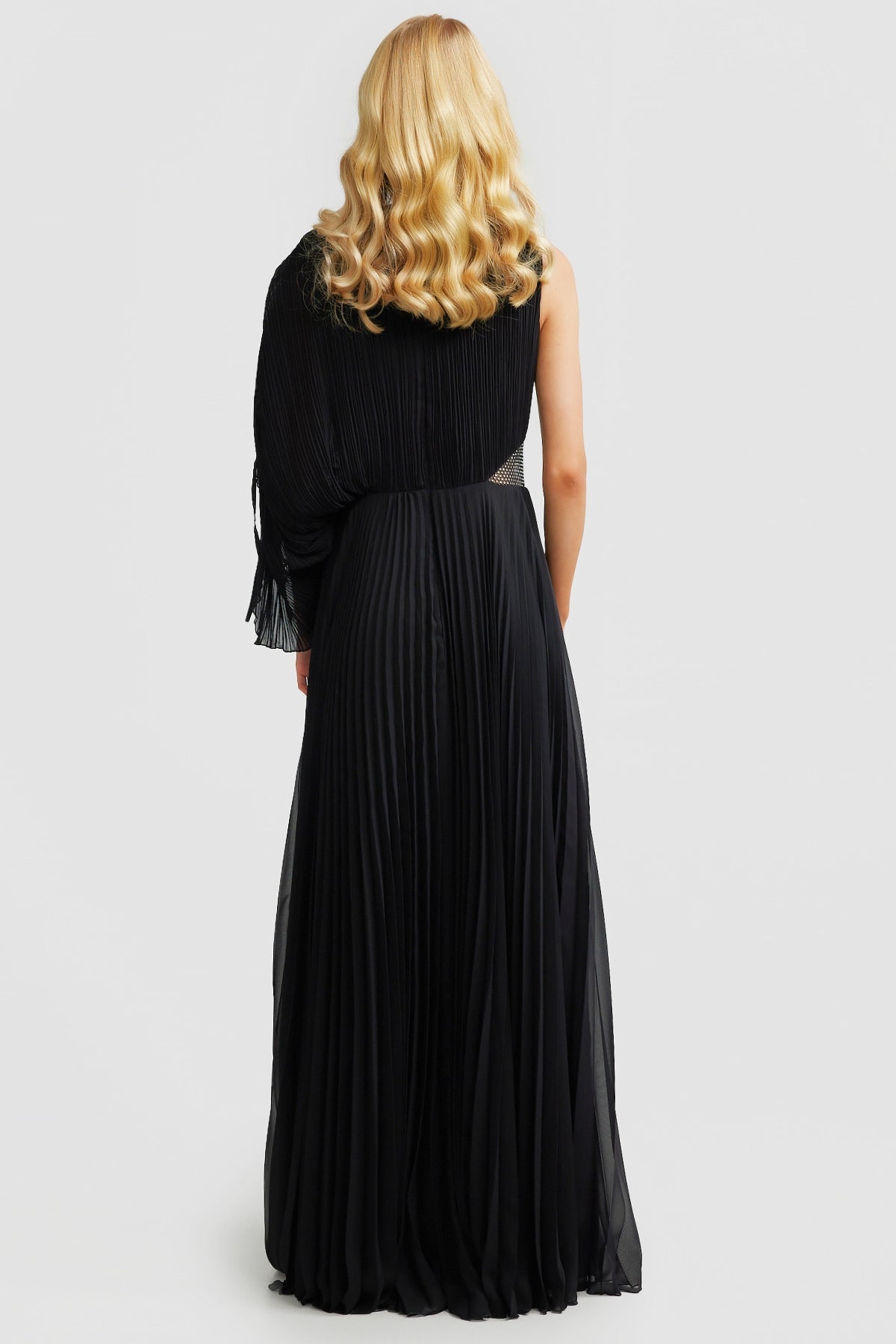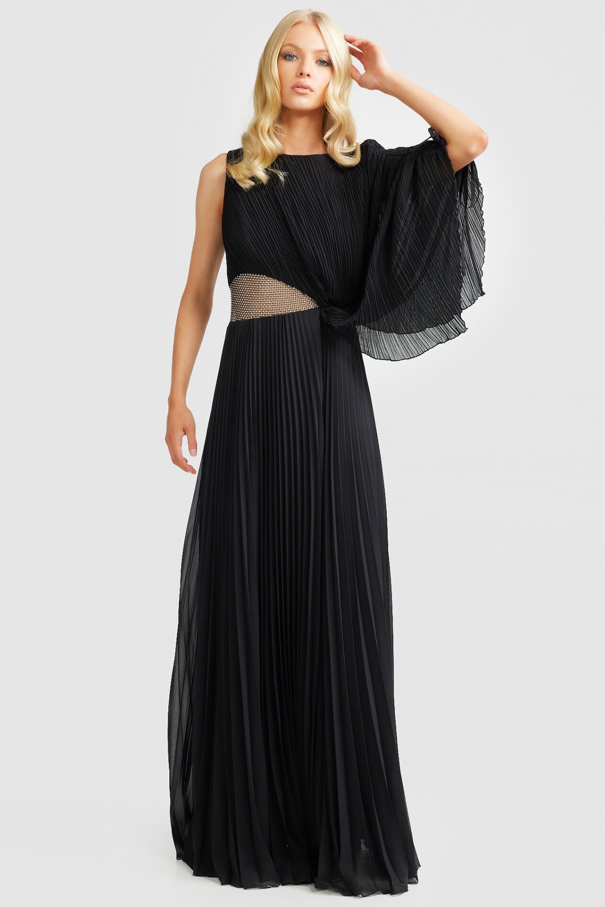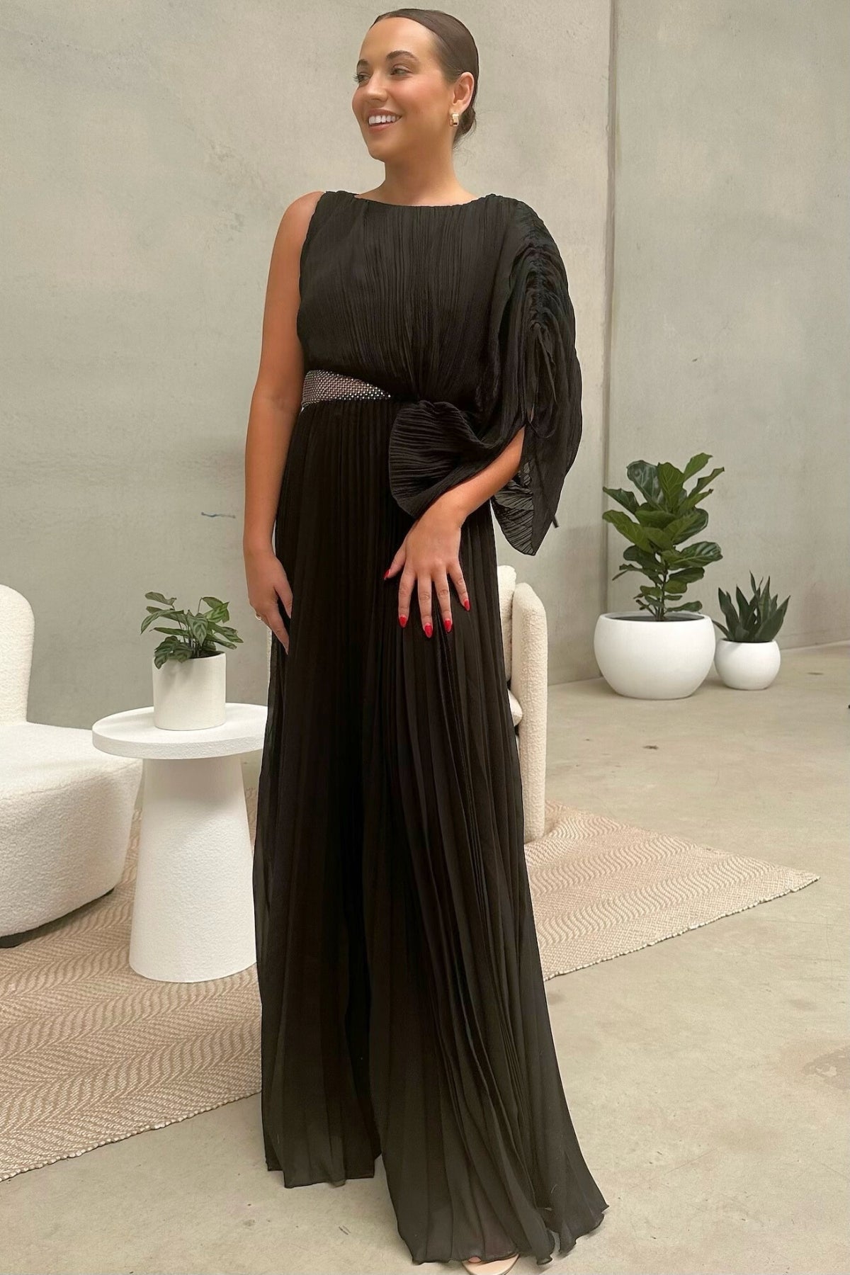 Welcoming the Lorenza Gown, a bold and pleated asymmetrical maxi dress to celebrate your next special occasion. Featuring a boat neckline and draped adjustable sleeve. Elevate your look with a glimmer of sparkle featuring a panel of diamantés amongst a stunning sheer mesh. Available in Black and Raspberry.