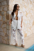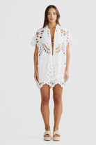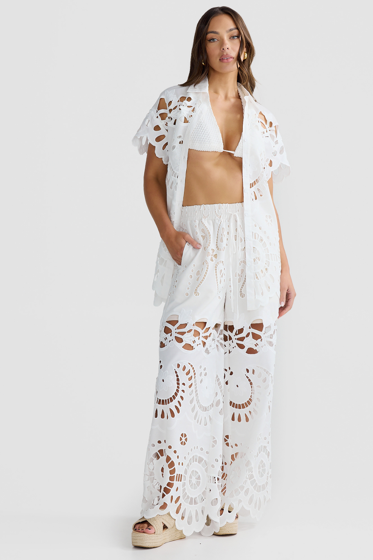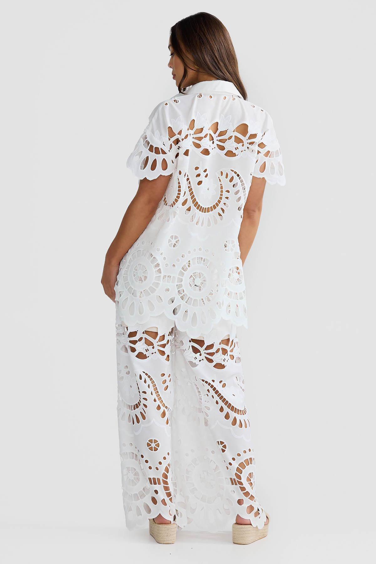 The Jada Shirt is a modern twist on a classic silhouette. Featuring intricate laser-cut detailing, forming elegant, geometric patterns throughout the fabric. The relaxed fit, offers comfort and style, while the scalloped edges add a delicate, feminine touch. The shirts open front can be worn buttoned or unbuttoned, allowing for versatile styling as a cover-up or a stand-alone statement piece.