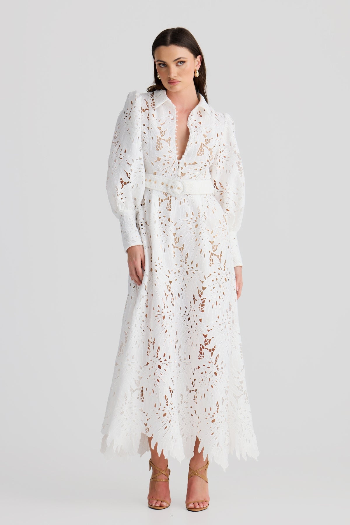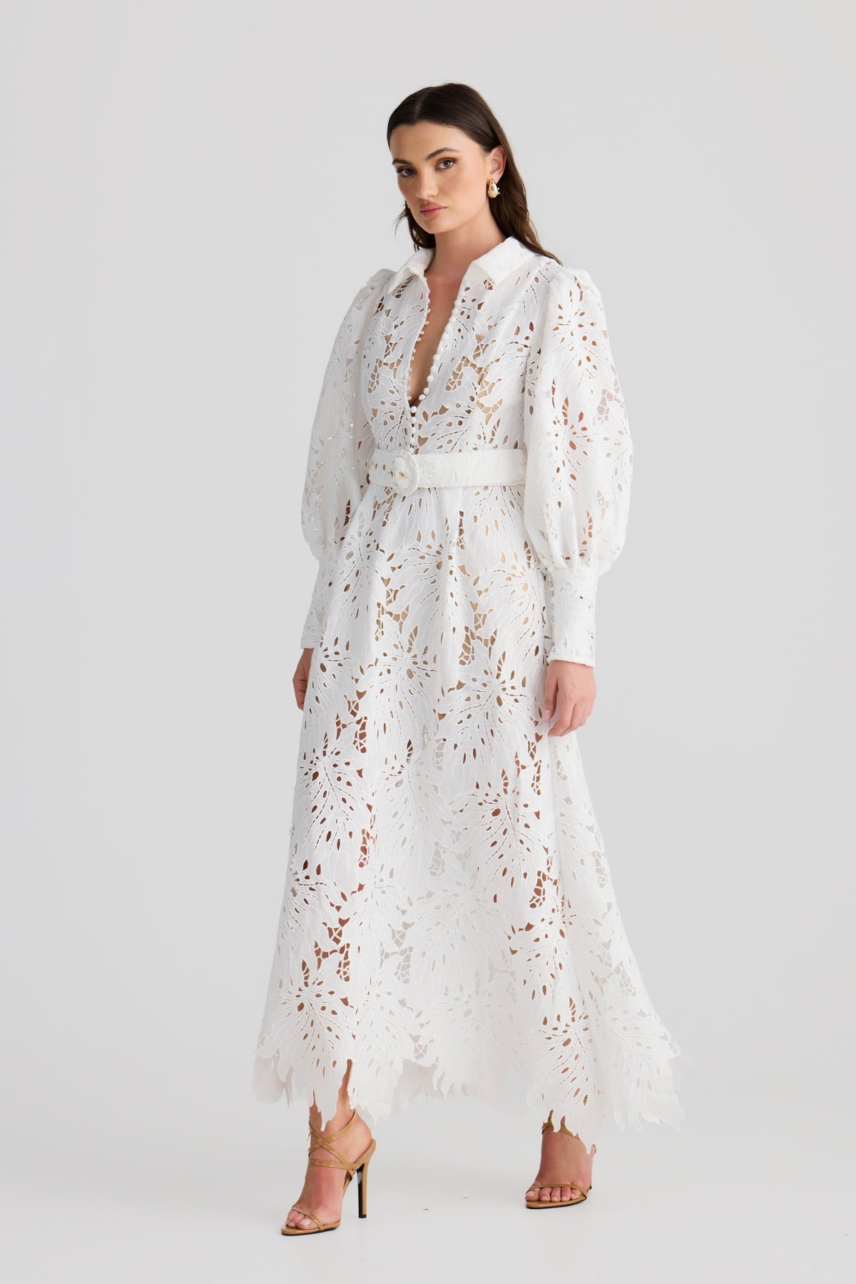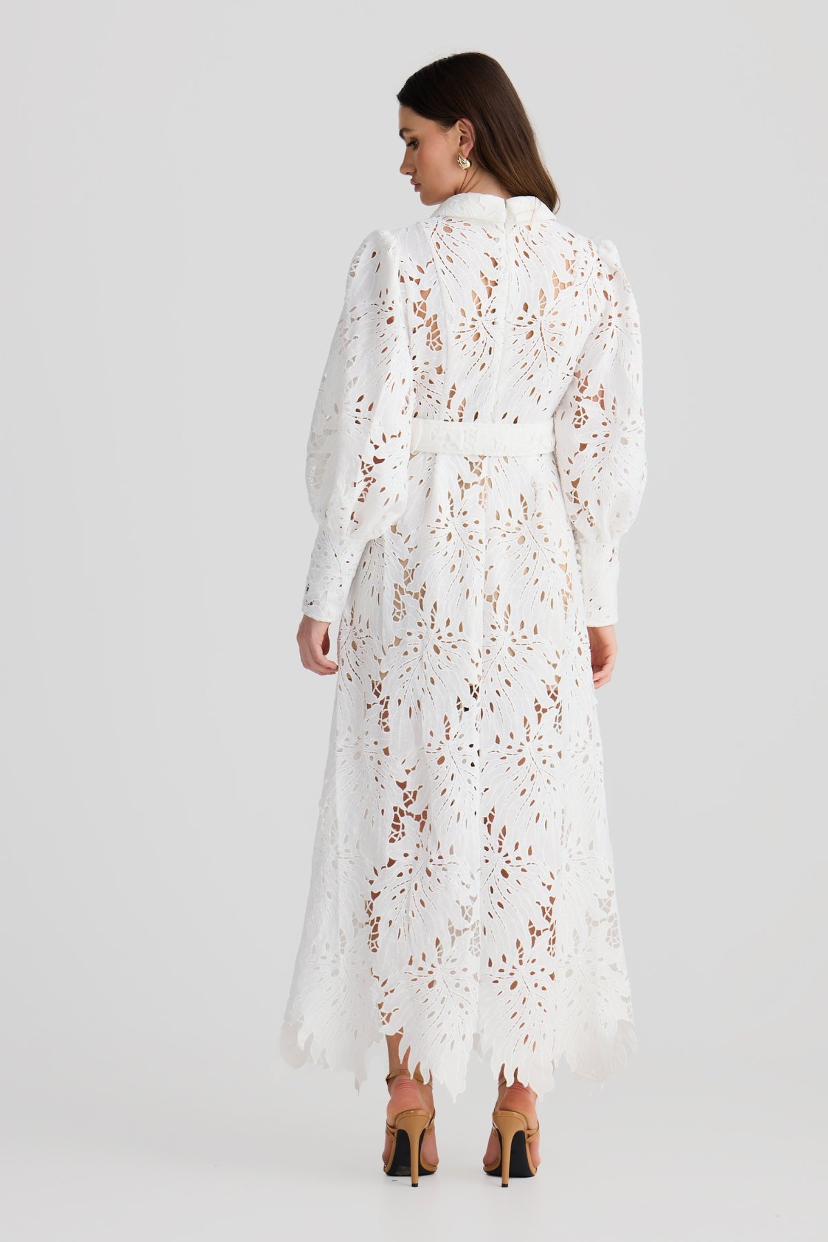 This exquisite lace dress exudes elegance and refinement. Featuring intricate palm leaf lace detailing, it boasts V-neckline, voluminous long sleeves, a figure-enhancing belted waist and uniquely detailed scalloped hem. The silhouette and dome buttons along the neckline and cuffs adds a timeless appeal, making it perfect for day to night dress that will be sure to make you feel a world of opulence.