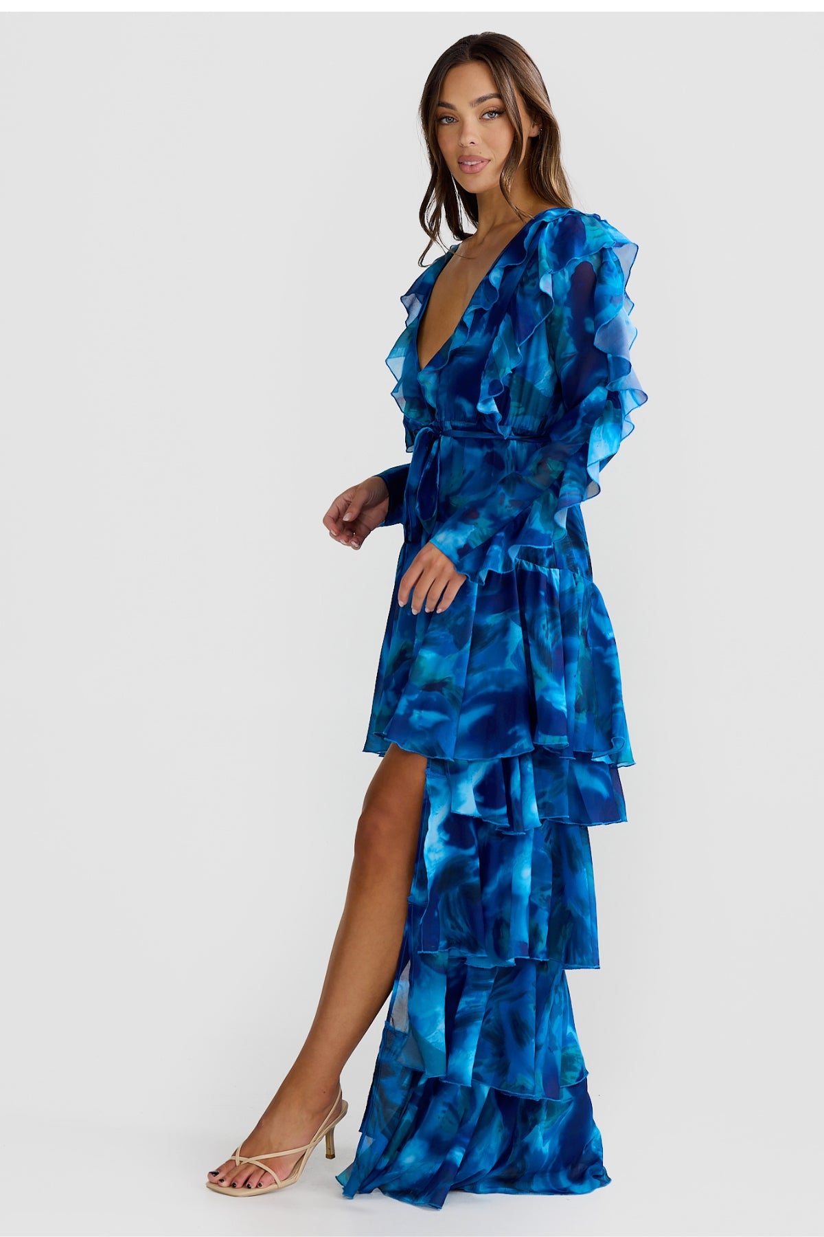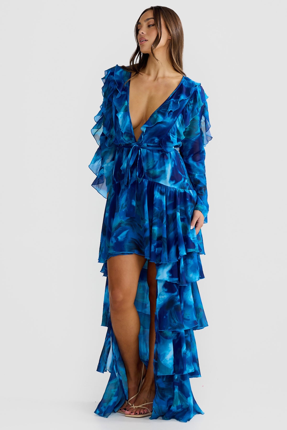 Embrace your free spirit with the Solana floaty chiffon Dress. Featuring this season's abstract blue floral print that dances with every movement. The layered ruffles with a high-low design bring edge to a bohemian flare. Ideal for warm-weather adventures or laid-back celebrations, this dress is a must-have for your wardrobe.