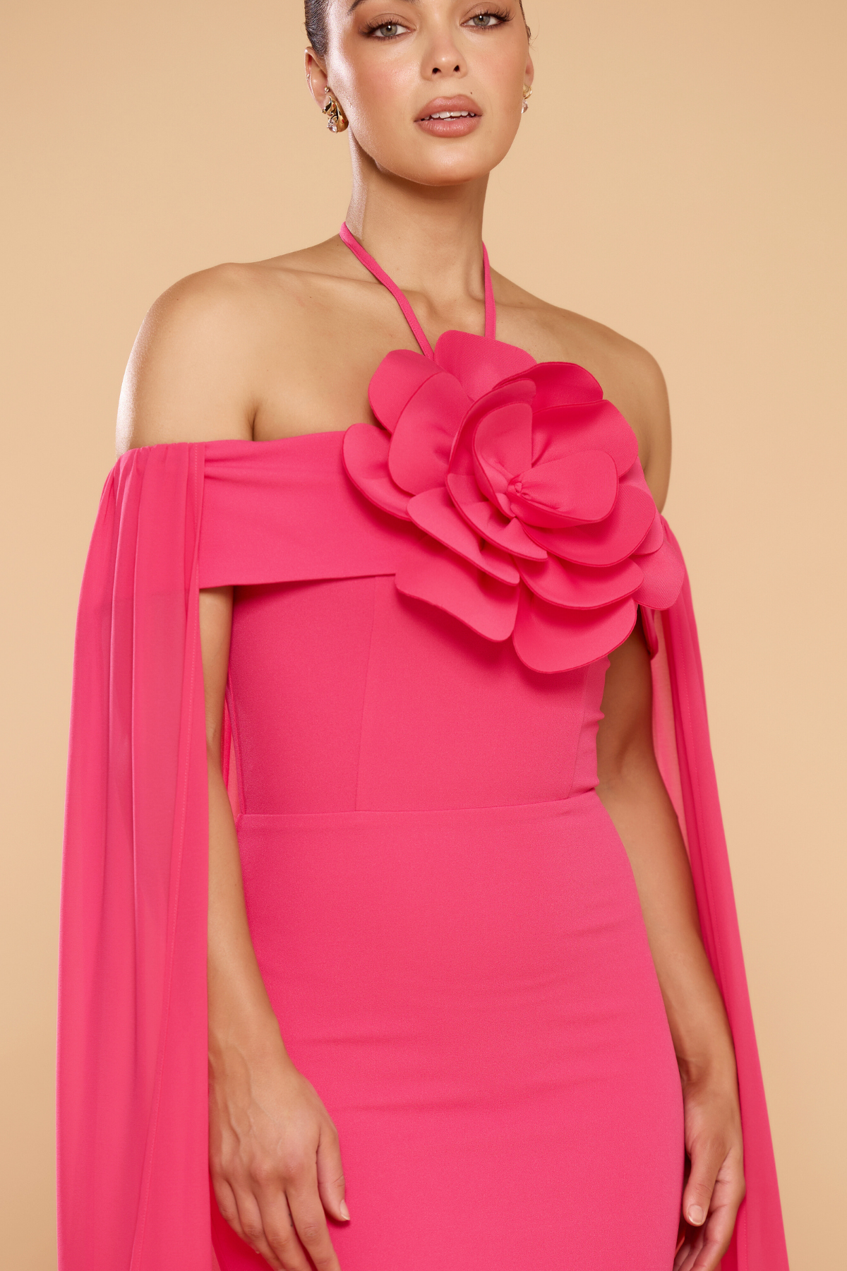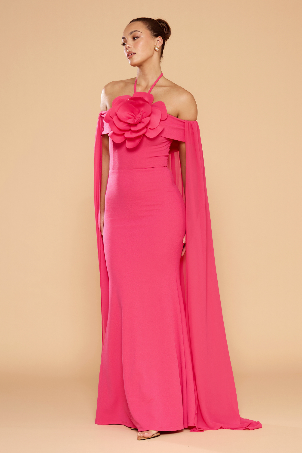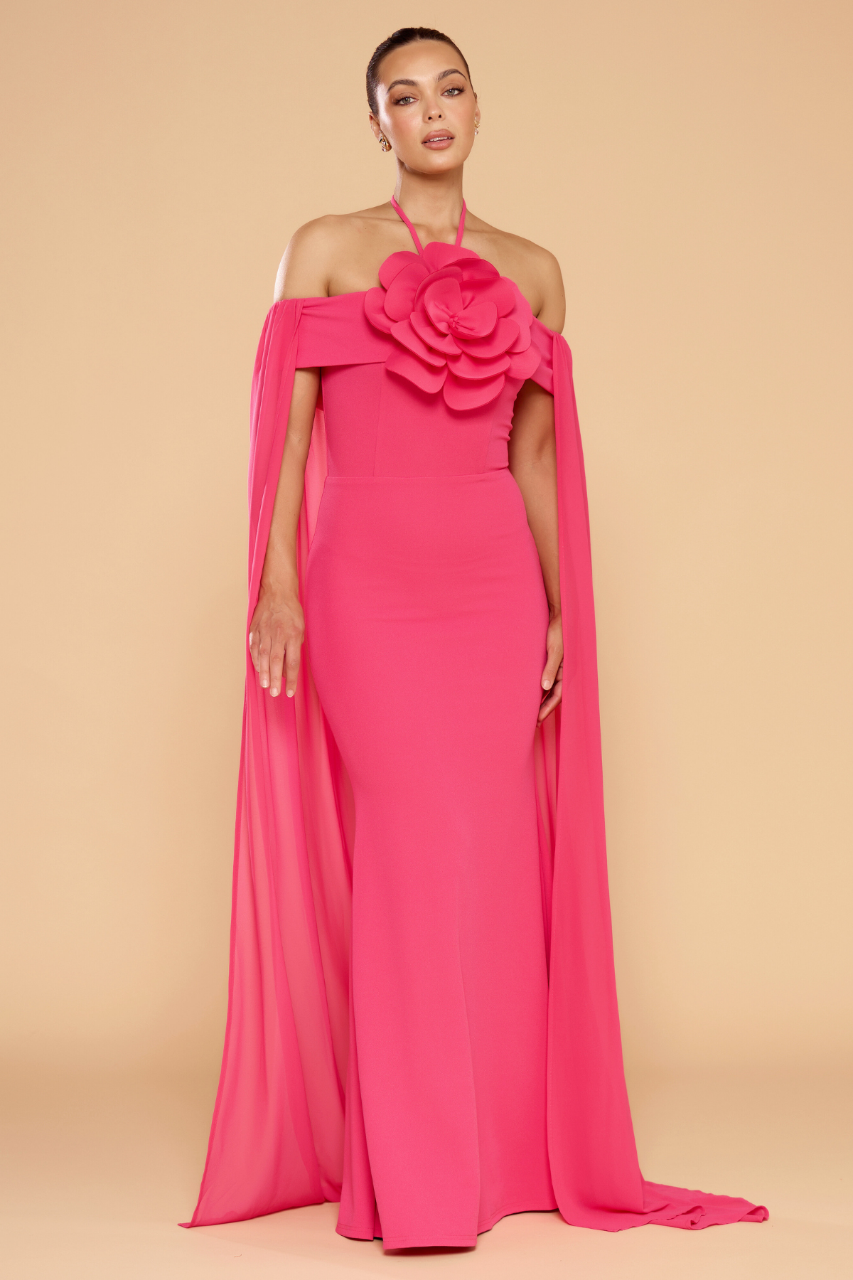 Make a lasting impression in the Chloe Cape Halter Gown, a masterpiece of romantic design and dramatic flair. Presented in a vibrant hot pink, this floor-length gown is defined by its striking oversized floral appliqué and a sheer, ethereal cape that trails elegantly behind you. The sleek, body-skimming silhouette is balanced by the softness of the chiffon-style draping, offering a look that is both sophisticated and bold.