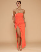 Make a bold statement in the Cinthia Dress, a strapless silhouette crafted in a tangerine palette. This eye-catching design features a fully boned bodice that sculpts and supports, highlighting your natural shape with elegant structure. Fluid in form, the wrap skirt cascades in deliberate folds, anchored by a sharp knot detail at the hip for a striking finish.