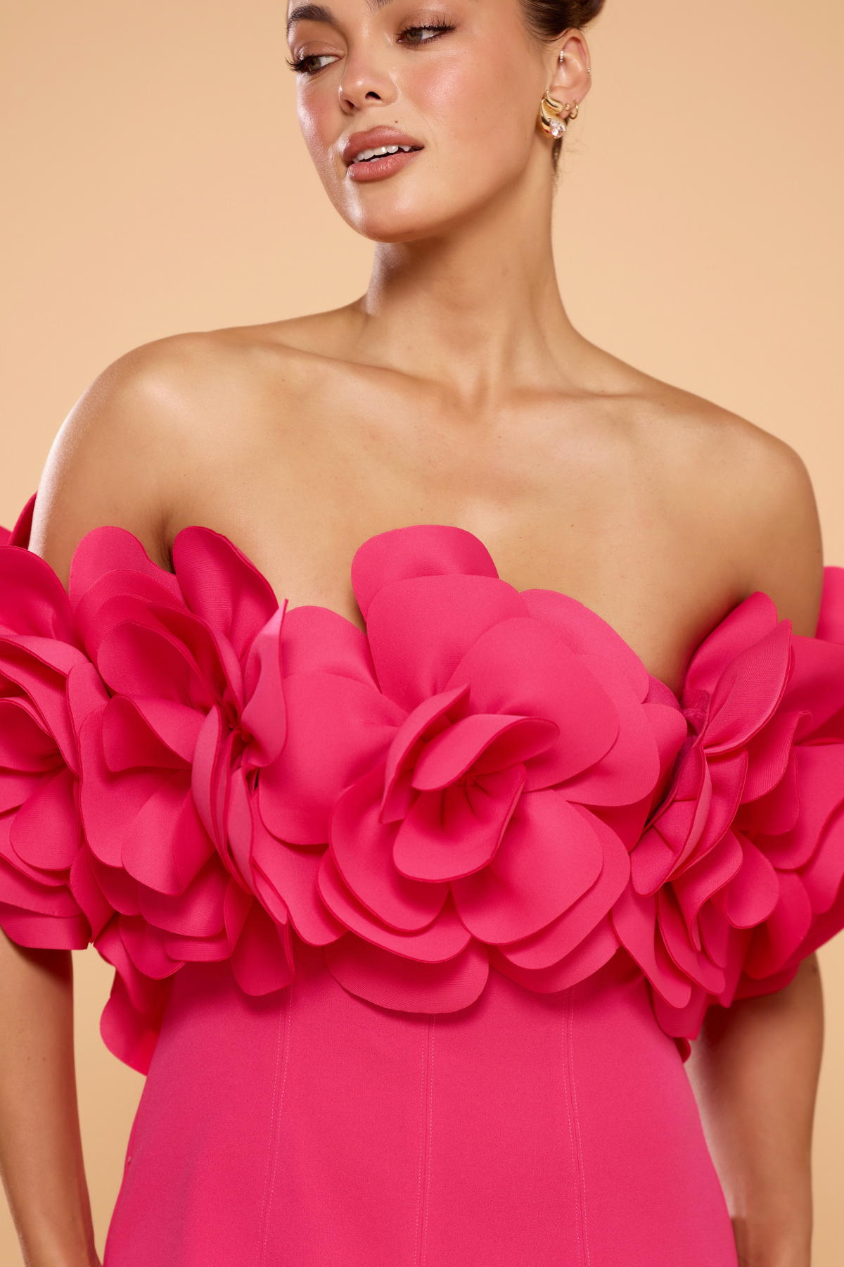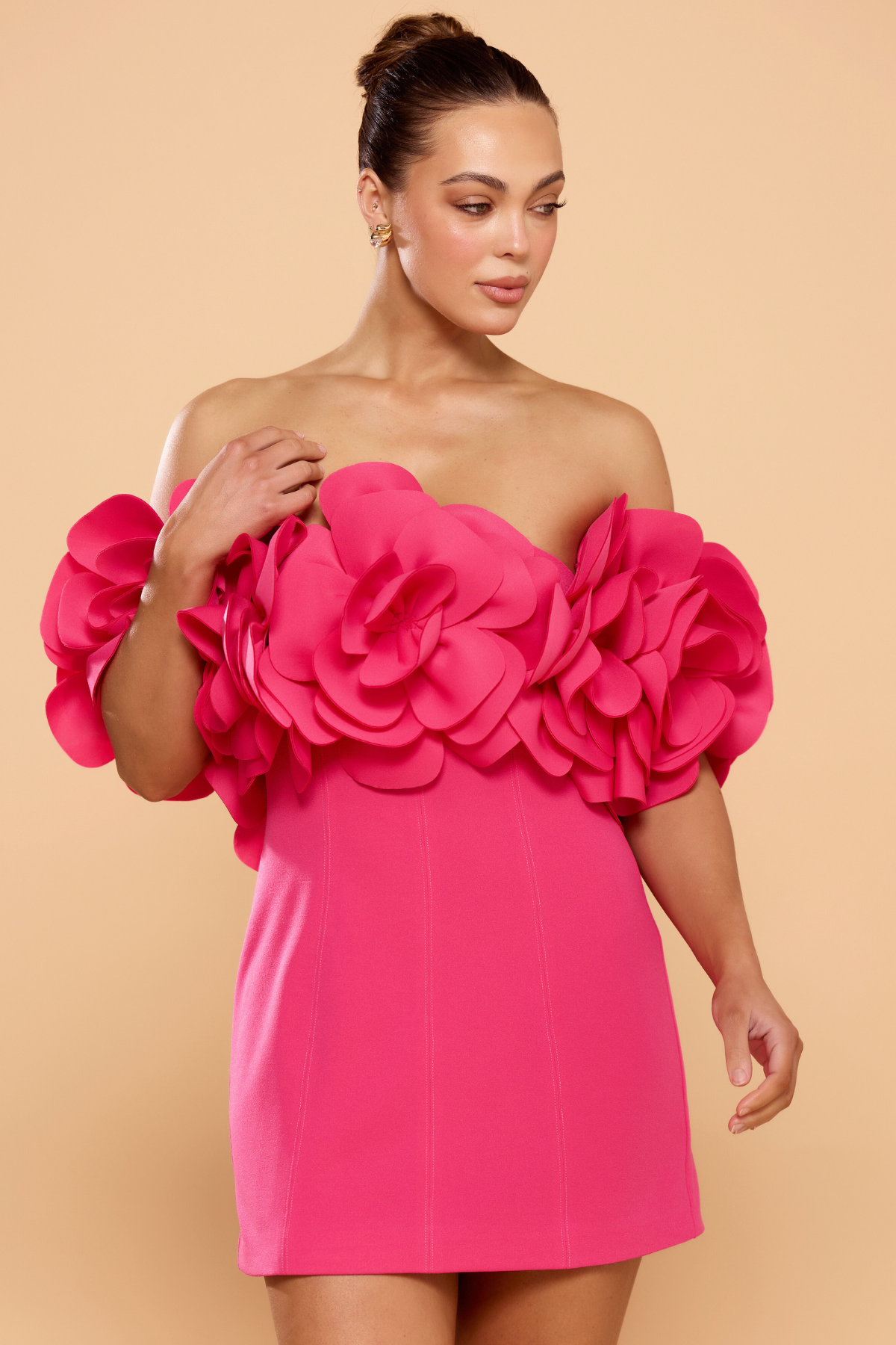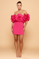 Make a lasting impression in this Daphne Off Shoulder Mini Dress, a vibrant statement piece designed for high-glamour celebrations. This striking hot pink dress features a sleek, body-con silhouette that is perfectly balanced by a dramatic, off-the-shoulder neckline adorned with an abundance of 3D floral appliqués. It is the ultimate fusion of modern structure and feminine romance, ensuring you stand out at any cocktail event.
