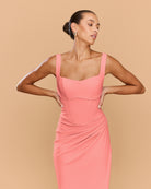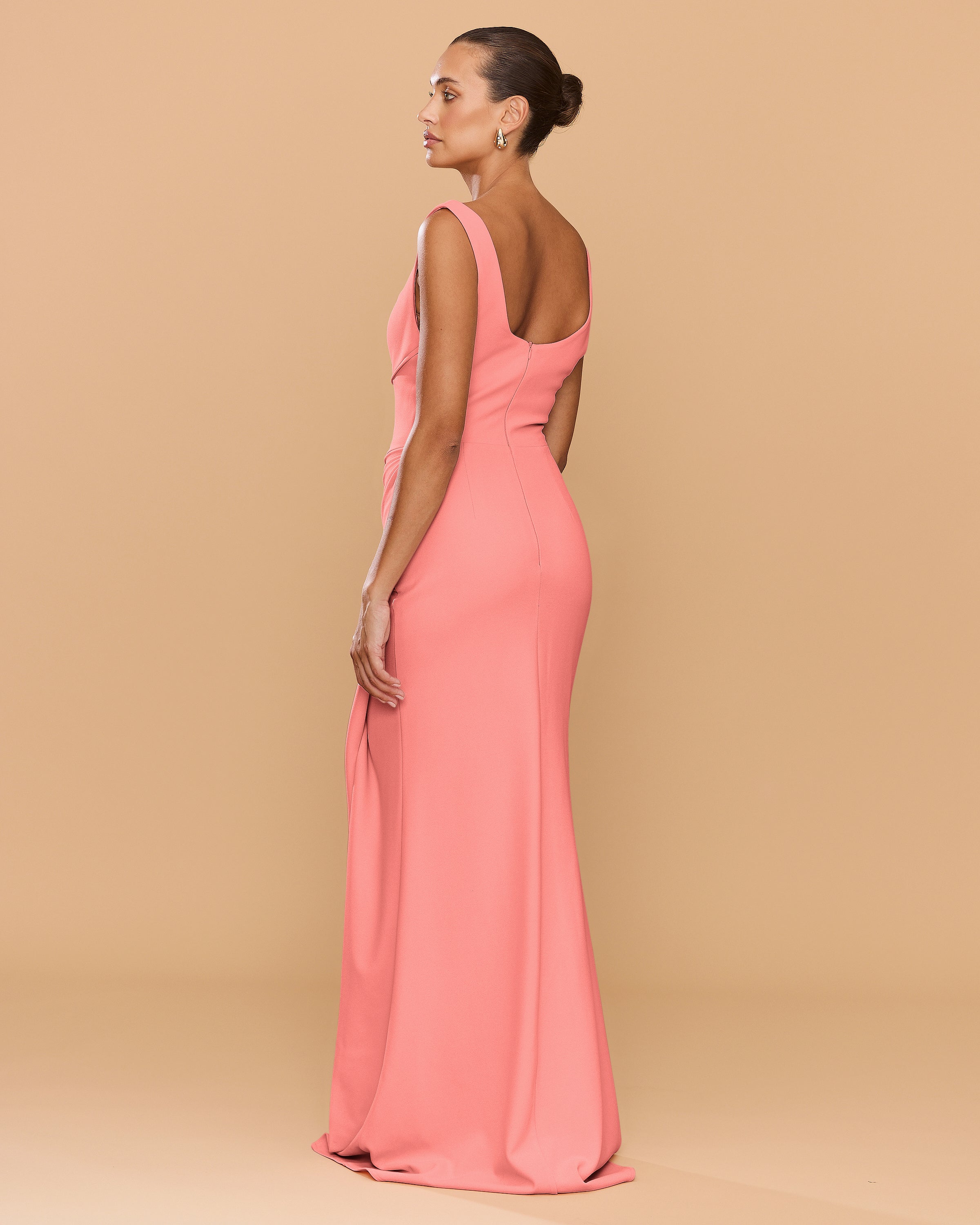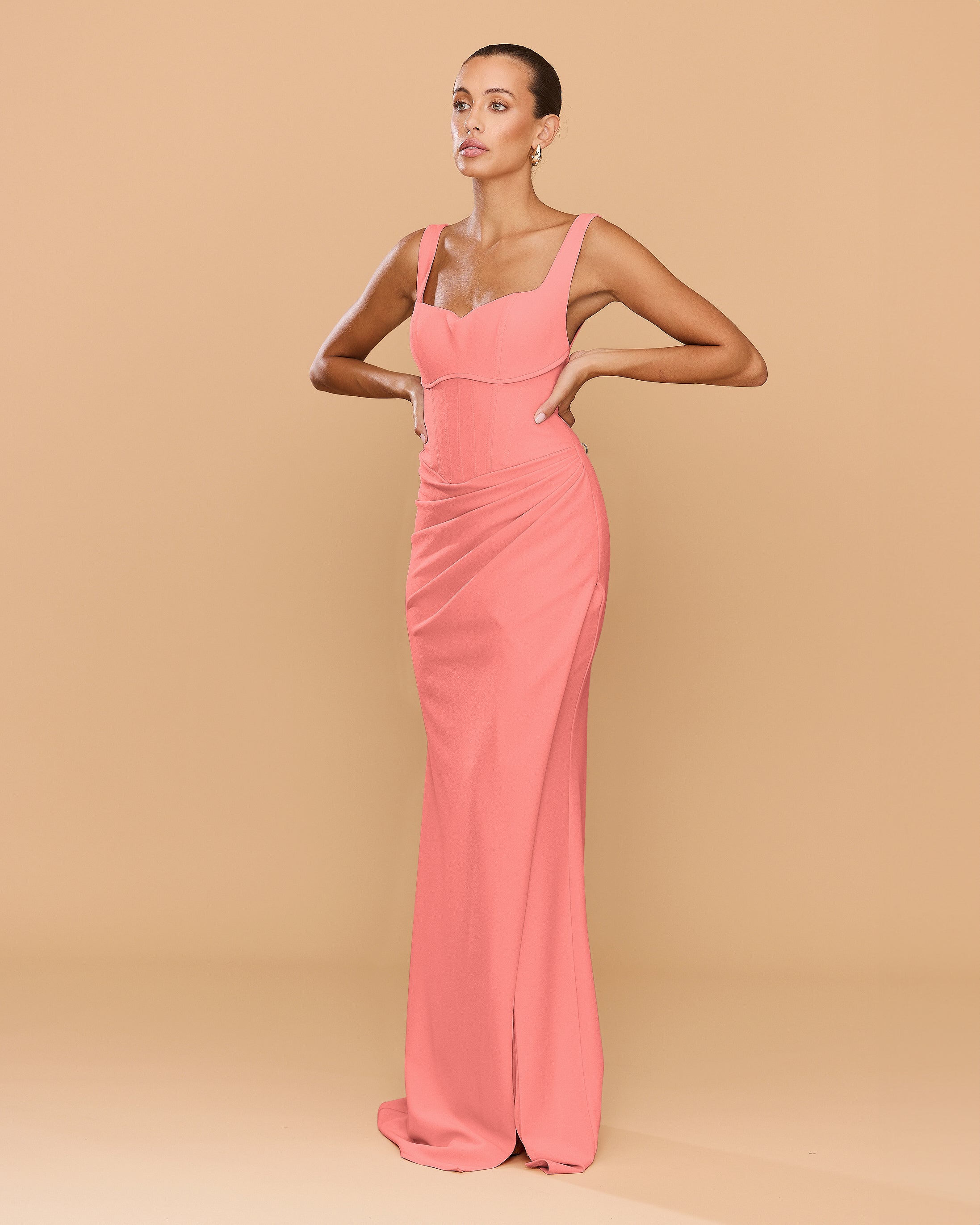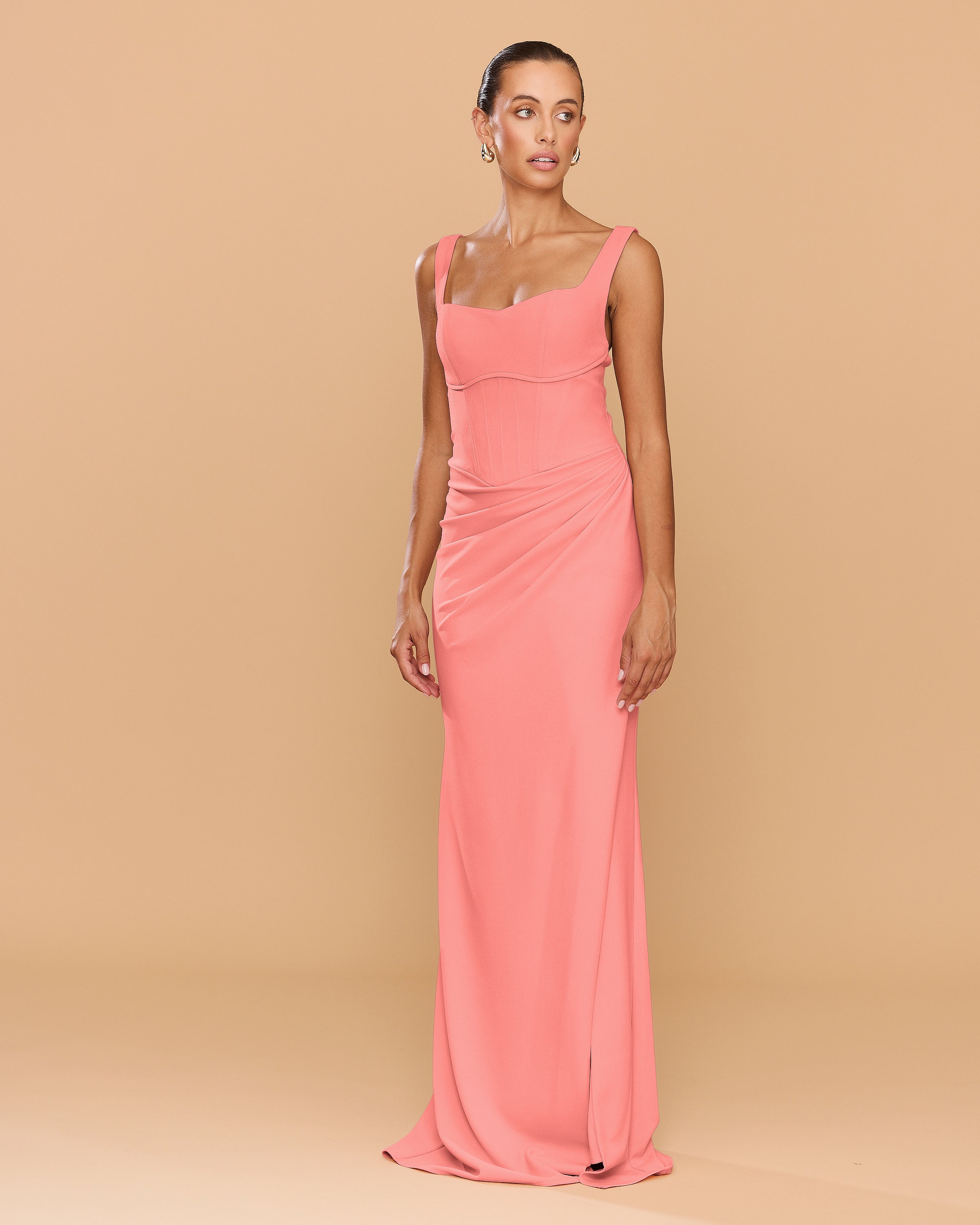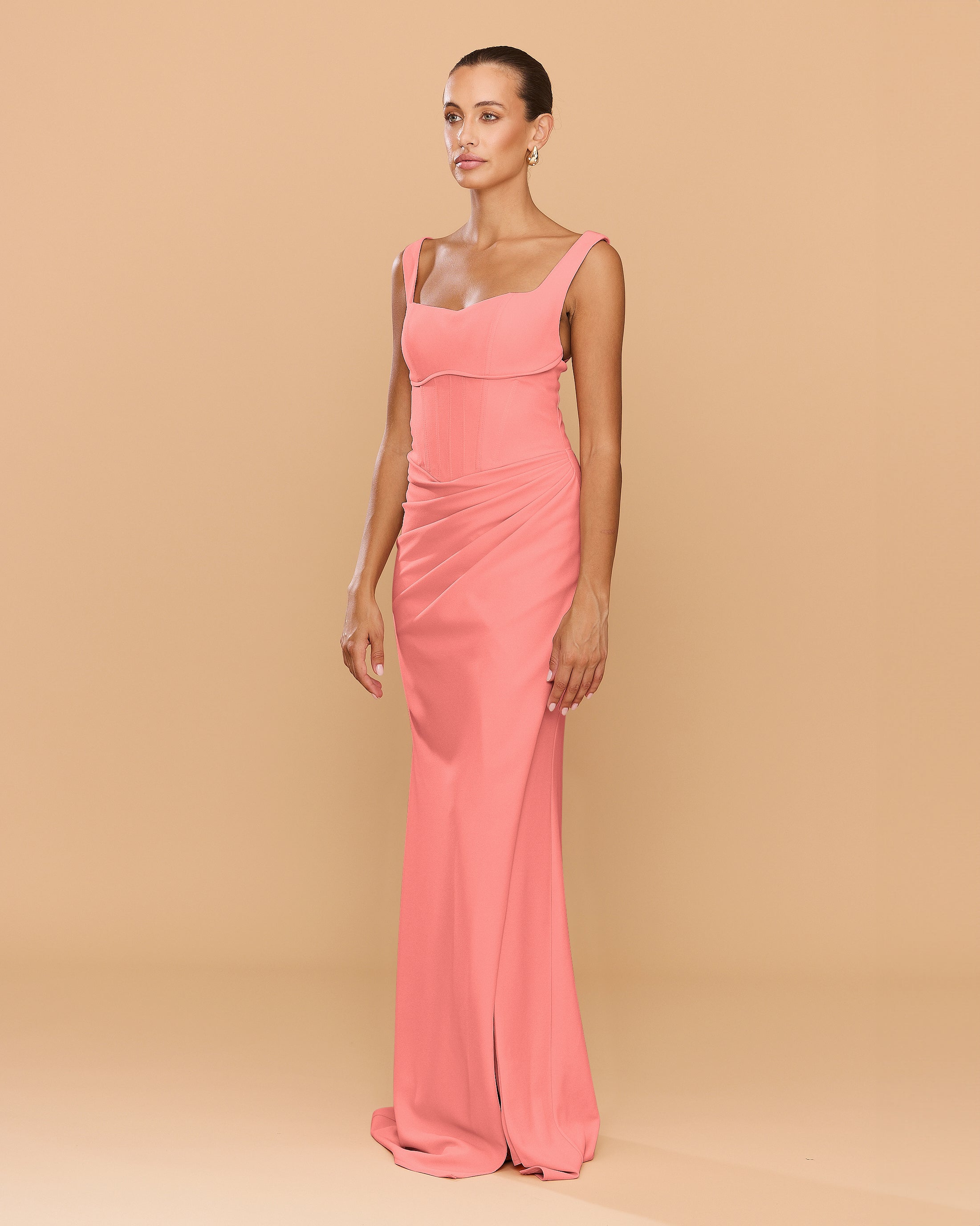 Step into elegance with the Elena Gown designed to sculpt and accentuate the female form. The full-length gown exudes timeless sophistication, featuring a structured bodice with a 90's inspired square neckline and a curved under bust pipping detail. The draping cascades gracefully along the waist, leading to a cross over split that can be worn either closed or open. Made from our premium stretch bonded crepe fabric, the Elena Gown combines comfort with style.