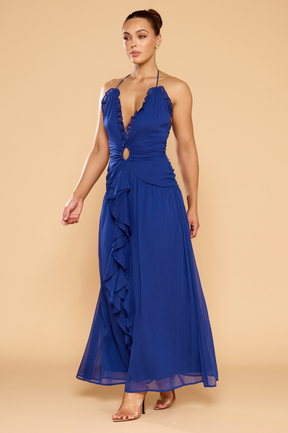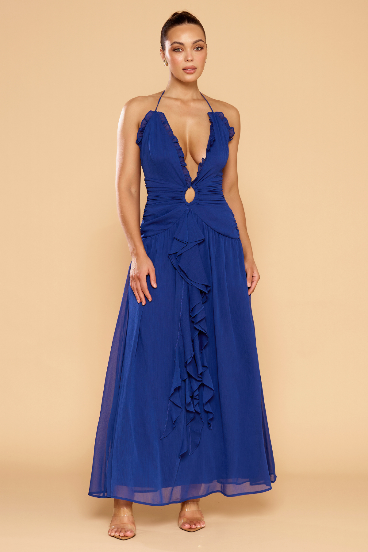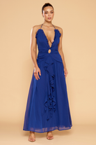 The Harmony Halter Ruffle Dress brings modern romance to life in a vibrant cobalt blue finish. Designed with a plunging V-neckline and soft ruffle detailing, the silhouette flows into a cascading maxi skirt for graceful movement.