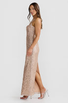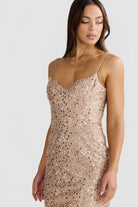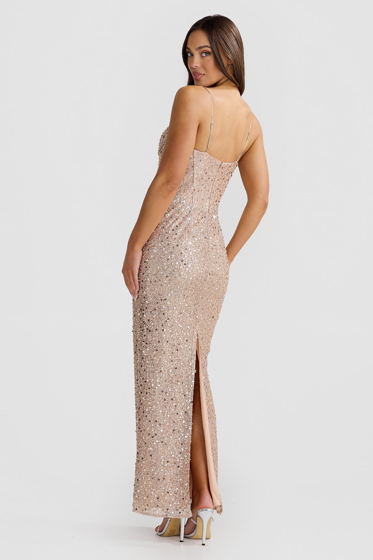 Steal the spotlight with the Jacinta Gown in Rose Gold. This floor-length gown is a masterpiece of elegance and glamour, featuring a form fitting silhouette adorned with all-over shimmering sequins. The adjustable straps and sweet-heart neckline exude sophistication, while luxurious pearl and sequin fabrication ensures you'll shine at any event. Enjoy celebrating life's special moments in the gown designed to make you feel confident and radiant. Available in Ivory and Rose Gold.