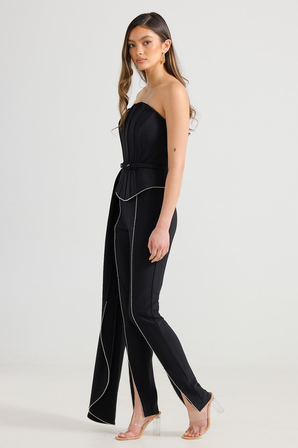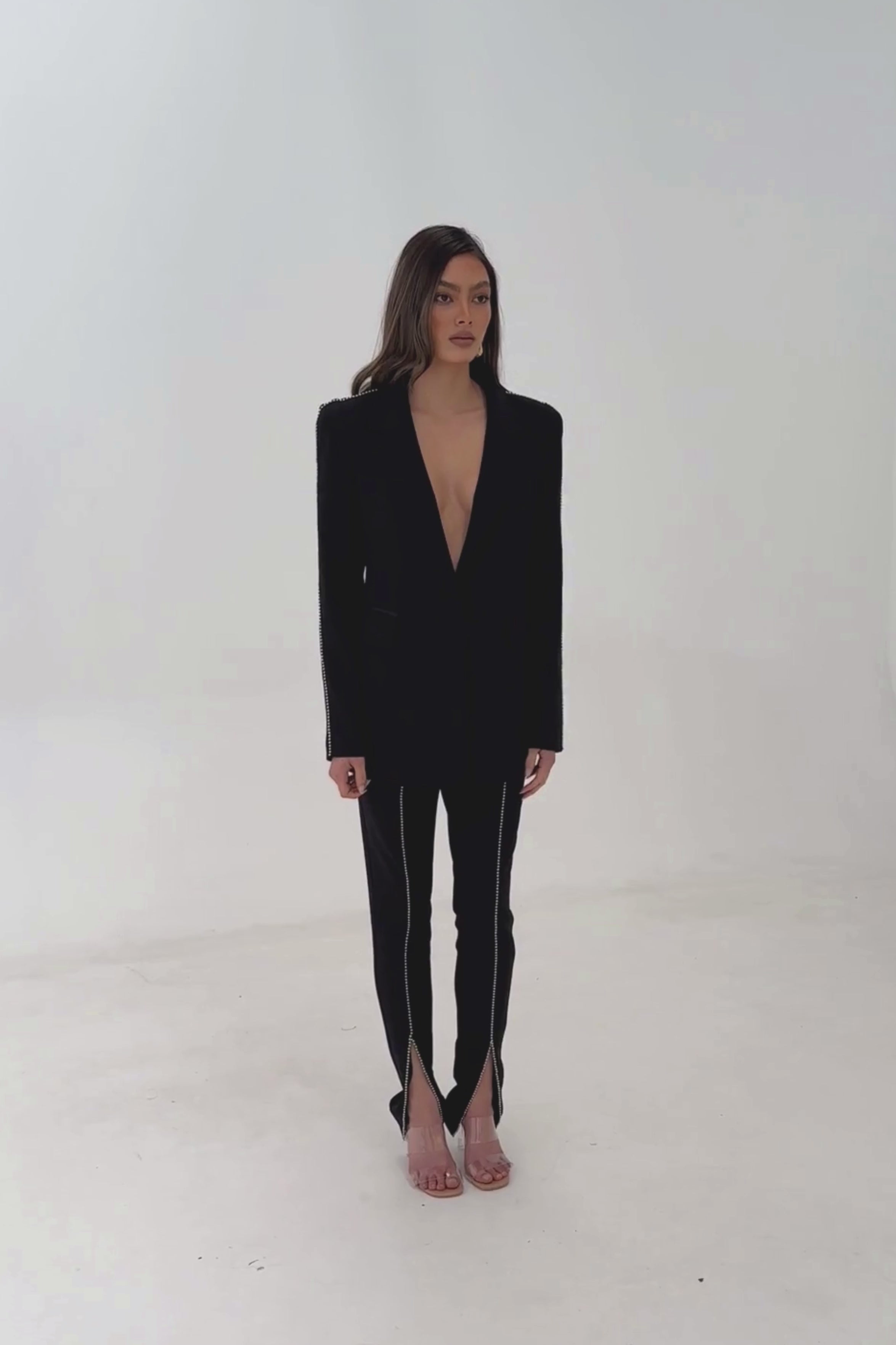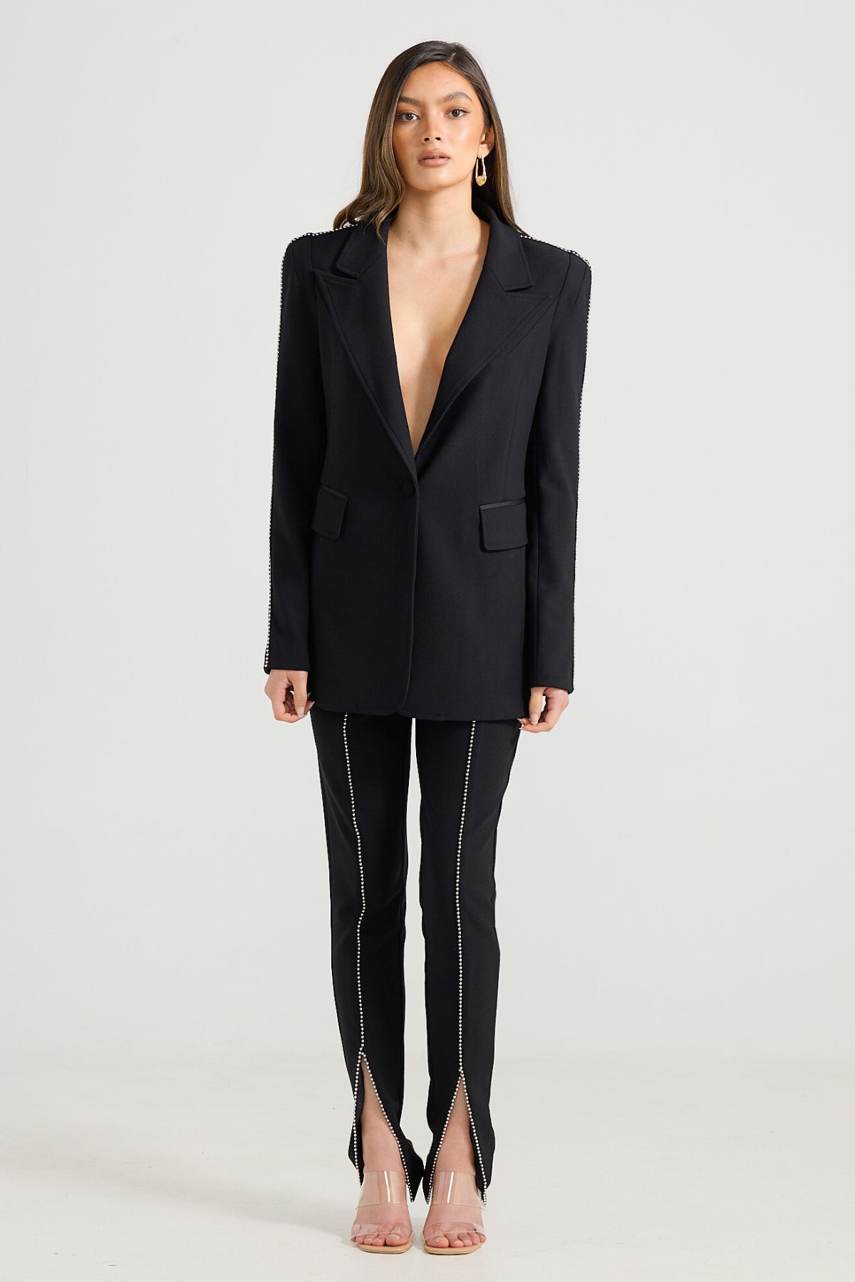 Enliven your outfit with The Jazz Pant. Tailored in a super slim fit and exaggerated high-waist silhouette, this pant features a unique studded trim through the center-front split. Style the staple pant with our Aubrey blazer or a crisp white shirt.