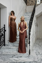 Make a bold statement with the Saskia Halter Dress in bronze. Featuring an adjustable wrap-around neck tie to suit all shapes. Saskia embraces originality in our exquisite embossed metallic satin fabrication. Perfect for bridesmaid dresses or your next black tie event.
