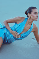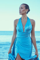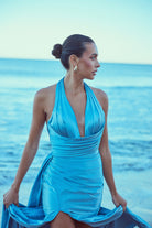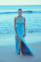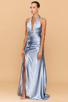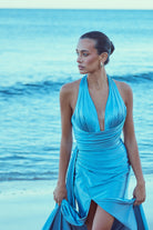 A study in fluid form and modern elegance, the Zenia Halter Gown is crafted from lustrous stretch fabric that catches the light with every movement. The high neckline evokes quiet confidence, while precise tucks are artfully draped around the waist to contour and sculpt the silhouette. A cascading panel falls effortlessly from the waist, adding a sense of motion and refined drama.