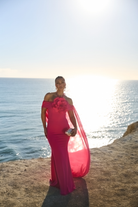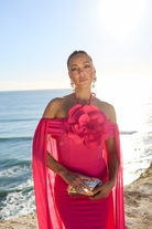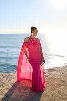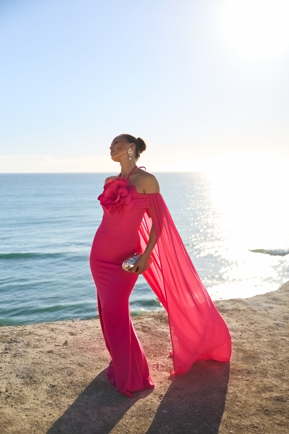 Make a lasting impression in the Chloe Cape Halter Gown, a masterpiece of romantic design and dramatic flair. Presented in a vibrant hot pink, this floor-length gown is defined by its striking oversized floral appliqué and a sheer, ethereal cape that trails elegantly behind you. The sleek, body-skimming silhouette is balanced by the softness of the chiffon-style draping, offering a look that is both sophisticated and bold.